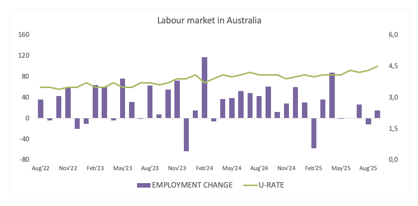 Der Arbeitsmarkt zeigt jedoch Anzeichen von Ermüdung. Die Arbeitslosenquote stieg im September von 4,3% auf 4,5%, während die Beschäftigungsänderung nur um 14,9K Personen zunahm, was unter den Prognosen lag. Es ist noch kein rotes Signal, deutet jedoch darauf hin, dass das Einstellungs-Momentum nachlässt.