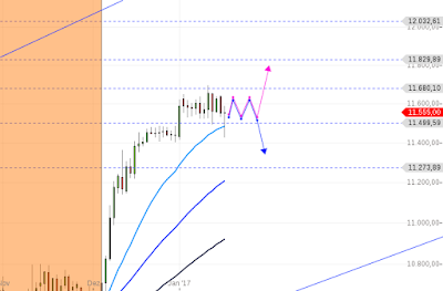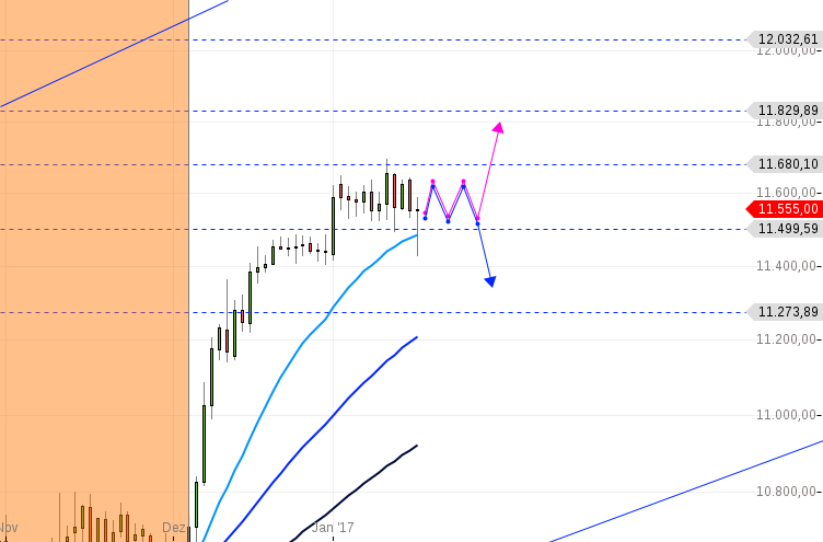 Grad noch hat er die Kurve gekriegt. Aber so eindeutig wurde die Lage dennoch nicht. Ich habe die fehlenden Wellen eingezeichnet, am Ende erwarte ich eine Bewegung entweder nach oben oder unten. Das wird sich zeigen.....