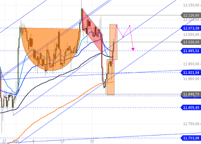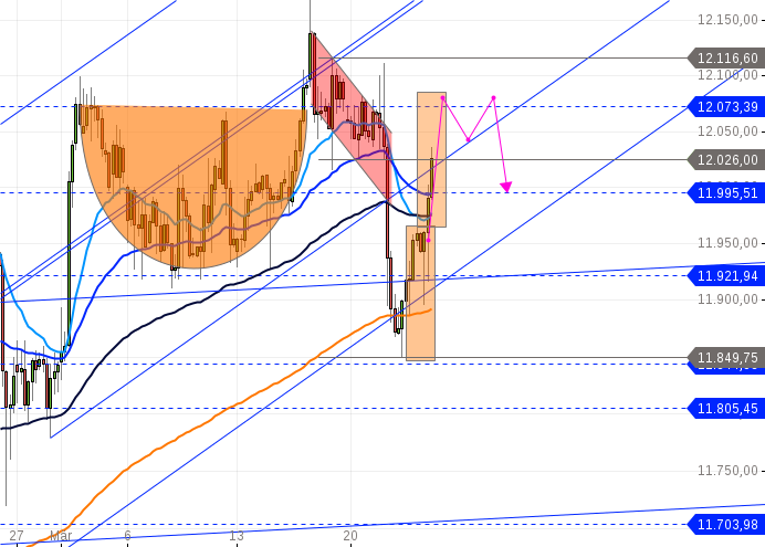 Mit diesem Anstieg könnte der Dax wieder Richtung 12100 Punkte steigen, eventuell auch die Jahreshoch testen. Darüberhinaus sehen die Wahrscheinlichkeiten sehr schlecht aus.