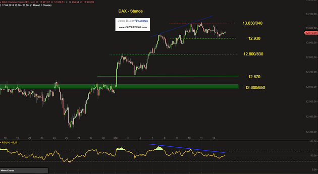 Es bleibt dabei, dass ich davon ausgehe das ein Bruch der 12.930, sollte er auf den Weg gebracht werden, einen stärkeren Intraday-Trend mit bearish-optmistischem Ziel um 12.800 auf den Weg bringen dürfte.