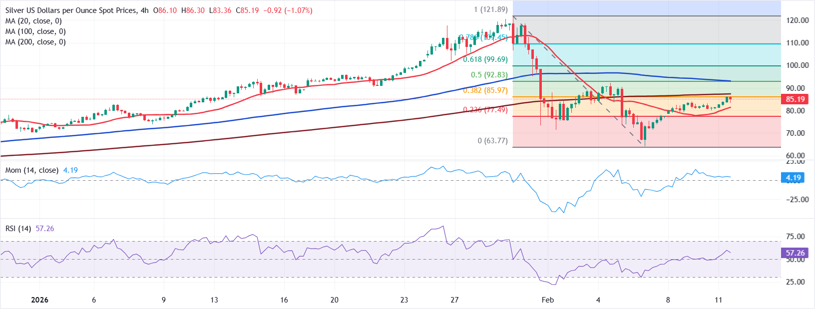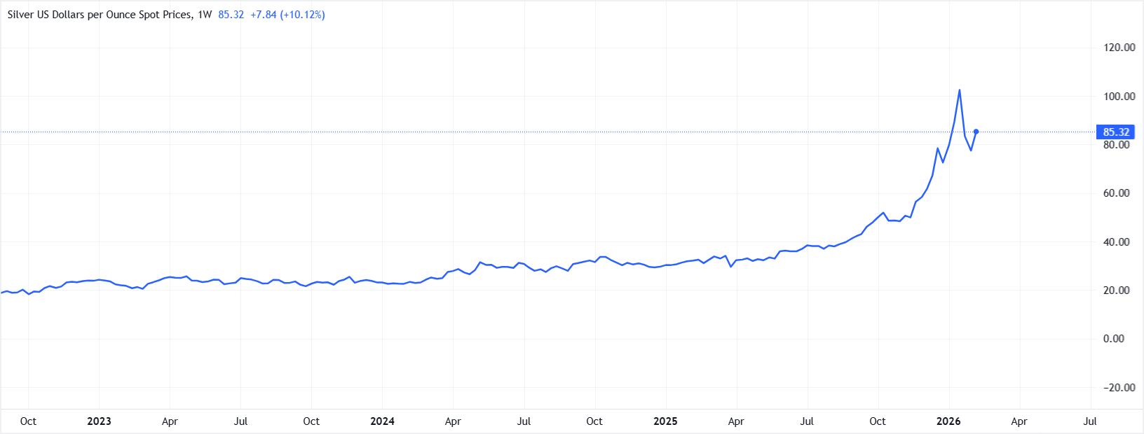 Die Erholung vom Tiefpunkt zeigt, dass sich der Silberpreis bei etwa 86 USD stabilisiert, was immer noch fast das Dreifache seines Wertes von Mitte 2025 ausmacht. Käufer sind offensichtlich vorsichtiger, da der Rückgang von den Rekorden wahrscheinlich mehr als ein Handelskonto ausgelöscht hat. Der Silberpreis ist jetzt ausgewogener, und das Metall bewegt sich gemäß einem normaleren Verhalten.