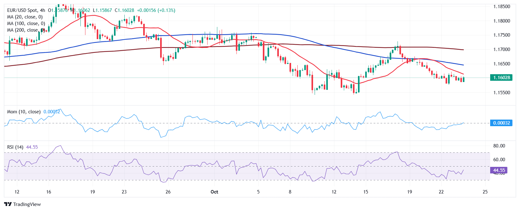 Kurzfristig und gemäß dem 4-Stunden-Chart scheint EUR/USD bereit zu sein, seinen Rückgang fortzusetzen. Das Paar entwickelt sich unterhalb aller seiner gleitenden Durchschnitte, wobei ein rückläufiger 20 SMA bei etwa 1,1610 dynamischen Widerstand bietet. Die 100 und 200 SMAs tendieren leicht nach unten darüber, im Einklang mit dem dominierenden bärischen Trend. Schließlich liegt der Momentum-Indikator unterhalb der 100-Linie, während der Relative Strength Index (RSI) richtungslos bei etwa 43 steht.