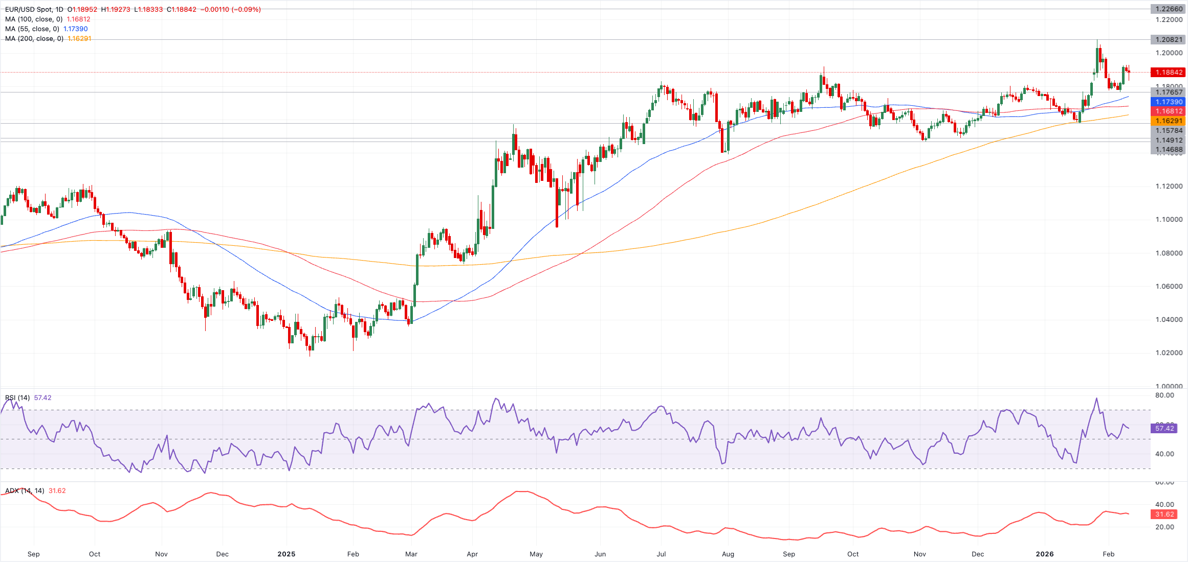 Die erste echte Unterstützung hingegen liegt bei 1,1775 am 2. Februar. Wenn der Preis darunter fällt, wären die 55-Tage- und 100-Tage-Simple Moving Averages bei 1,1732 bzw. 1,1681 gefährdet. Der 200-Tage-Simple Moving Average bei 1,1625 ist wichtiger. Wenn der Verkaufsdruck weiter steigt, würden das Tief von November 2025 bei 1,1468 (5. November) und das Tief von August 2025 bei 1,1391 (1. August) wahrscheinlich wieder ins Spiel kommen.