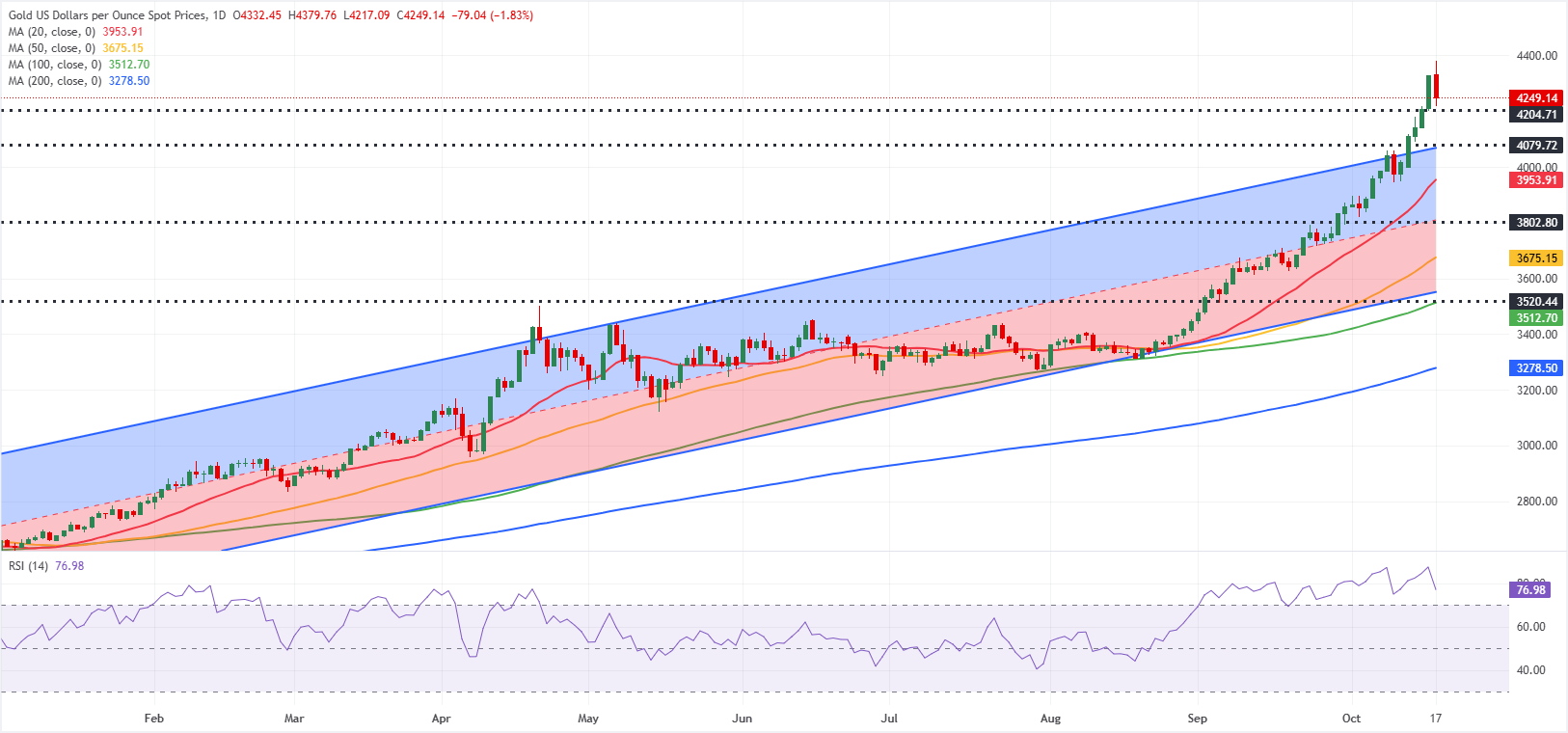 Die parabolische Rallye von Gold (XAU/USD) zeigte keine Anzeichen einer Verlangsamung und hob den Preis am Freitag auf ein neues Rekordhoch über 4.370 USD, bevor er nach unten korrigierte. In der Zukunft werden die Märkte weiterhin auf die Diskussionen über den Handelskonflikt zwischen den Vereinigten Staaten (US) und China fokussiert sein und die September-Inflationsdaten aus den USA genau unter die Lupe nehmen.