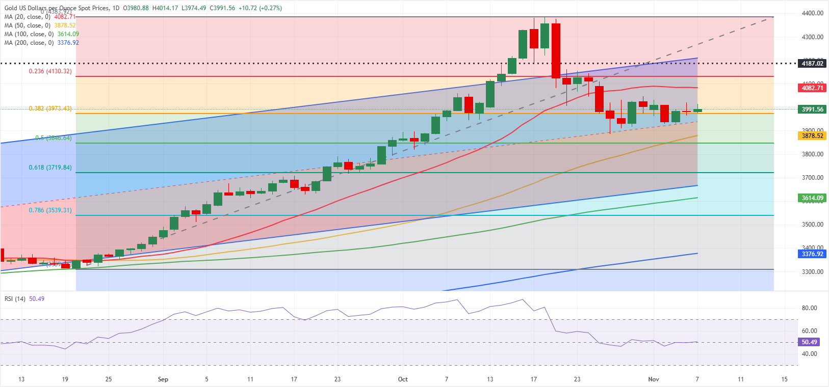 Die endgültige Datenveröffentlichung der Woche aus den USA zeigte, dass der Verbraucherindex der University of Michigan (UoM) im November auf 50,3 von 53,6 im Oktober gesunken ist. Da der USD den Abwärtsdruck vor dem Wochenende nicht abschütteln konnte, hielt Gold sich in der Nähe der 4.000 USD-Region.