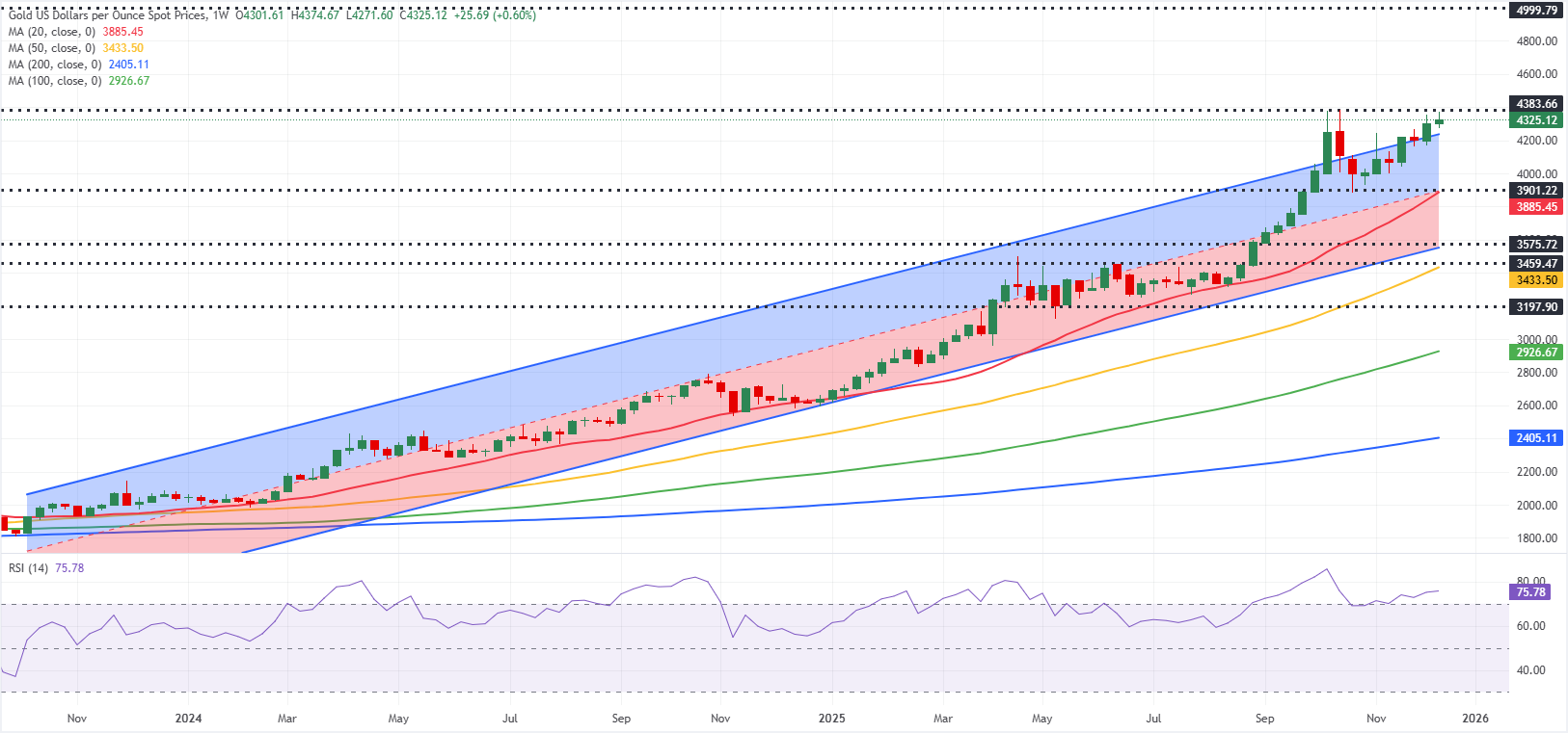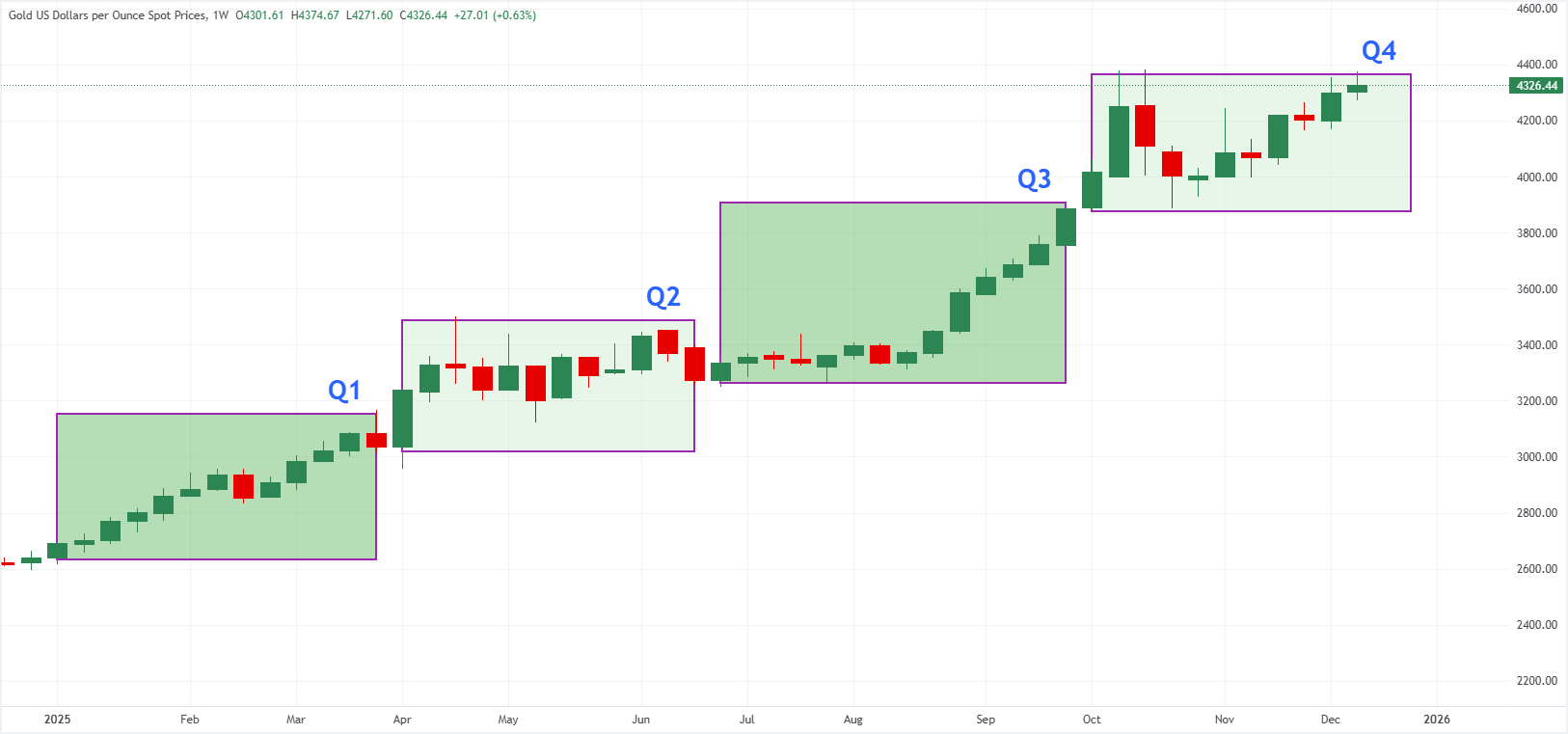 Gold (XAU/USD) begann das Jahr mit einer bullischen Note und verzeichnete im ersten Quartal beeindruckende Gewinne. Nach einer Konsolidierungsphase während der Sommermonate stieg das Edelmetall im dritten Quartal weiter an und erreichte im Oktober ein Allzeithoch von 4.381 USD. Obwohl XAU/USD nach unten korrigierte, weigerten sich die Käufer, die Zügel in der bevorstehenden Feiertagssaison abzugeben.