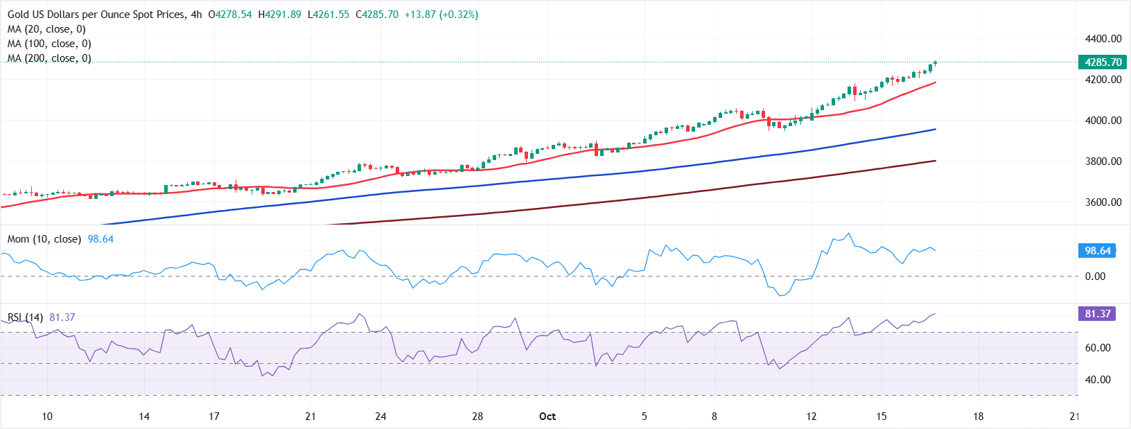 Das XAU/USD-Paar ist nun den fünften Tag in Folge gestiegen und hält das starke Aufwärtsmomentum im Tages-Chart aufrecht, trotz extremer überkaufter Bedingungen. Der Momentum-Indikator zielt fest nach oben bei etwa 113, während der Relative Strength Index (RSI) dasselbe Verhalten zeigt und bei 86 steht. Gleichzeitig liegt das Paar weit über allen bullischen gleitenden Durchschnitten, wobei der nächste bei etwa 3.923 $ liegt, dem 20 Simple Moving Average (SMA).
