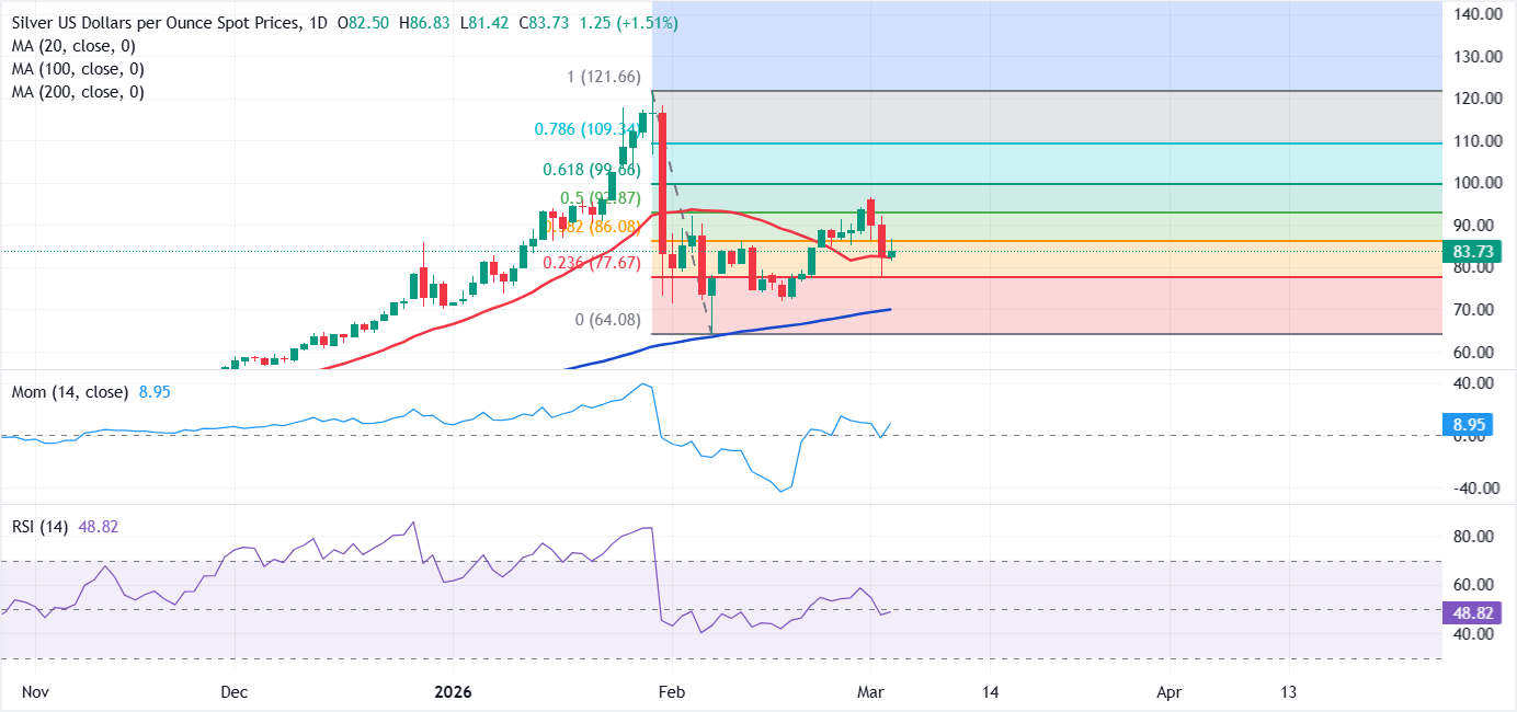 Nicht alles ist verloren für Silber, da technische Indikatoren im Tageschart zeigen, dass das Abwärtspotenzial weiterhin begrenzt ist. Technische Indikatoren haben um ihre Mittellinien wieder an Aufwärtsdynamik gewonnen und behalten moderate Aufwärtstrends bei. Gleichzeitig handelt das XAG/USD-Paar über allen seinen gleitenden Durchschnitten, hat jedoch derzeit Schwierigkeiten, über dem leicht bullischen 20 Simple Moving Average bei etwa 83,00 USD zu bleiben, was die erste Käuferlinie zieht.