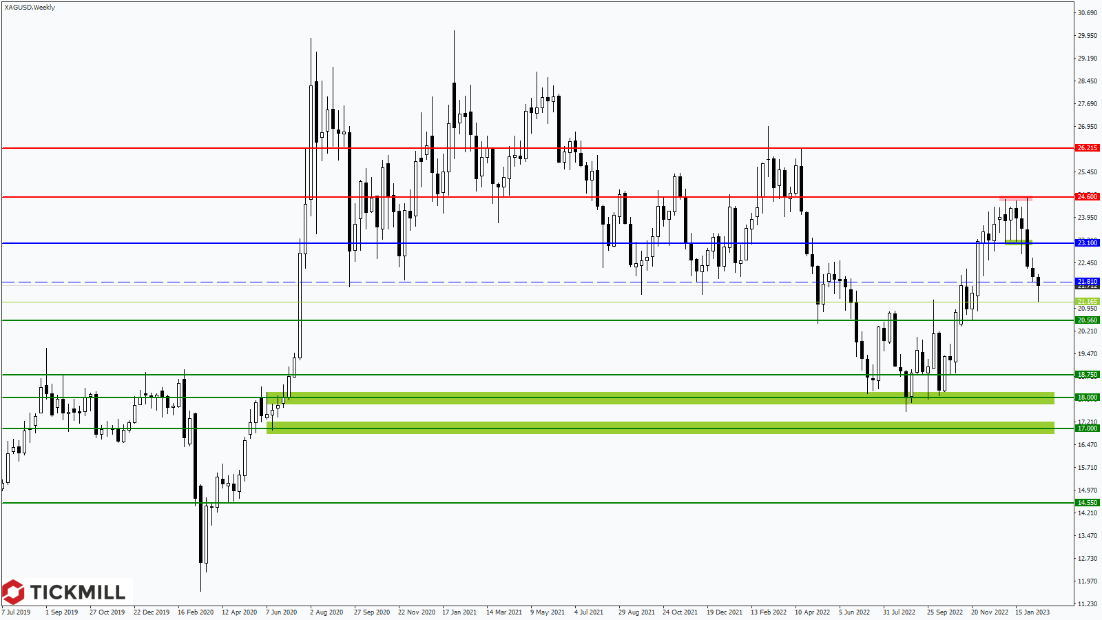 Legt man diese Entwicklung über den Wochenchartverlauf von Silber, ist die Korrelation zum US-Dollar und zum US-Zinslevel deutlich erkennbar. Silber hat bereits im Spätsommer 2022 mit einer Bodenbildung angefangen, die die Grundlage für den später entstandenen Aufwärtstrend auf Wochenbasis gelegt hat. Die Kursrückgänge der letzten Handelswochen stellen in diesem Kontext somit die Korrektur der Herbst- und Jahresendrally im Silber dar. Charttechnisch bietet der Bereich zwischen 20,50 USD bis 21,50 USD ein Unterstützungslevel aus, dass durchaus das Potential bietet, einen Boden für die nächste Rally zur Chartoberseite zu stellen. Allerdings muss auch klar gesagt werden, dass eine neue Rally durchaus auf die Unterstützung des Bondmarktes angewiesen ist. Wird die Marke von 20,50 USD abverkauft, rückt die Unterstützung an den Tiefs bei gut 18,00 USD in den Fokus.