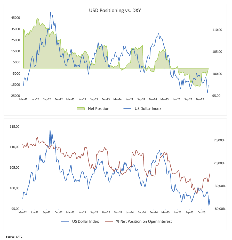 Die neuesten Positionsdaten der Commodity Futures Trading Commission (CFTC) bieten eine interessante Nuance unter der Oberfläche. Nicht-kommerzielle Händler haben ihre Netto-Short-Positionen im US-Dollar auf den niedrigsten Stand seit Mai 2025 reduziert, auf etwa 850 Kontrakte. Mit anderen Worten, die starke bärische Überzeugung, die sich zu Beginn des Jahres aufgebaut hat, beginnt zu schwinden.
