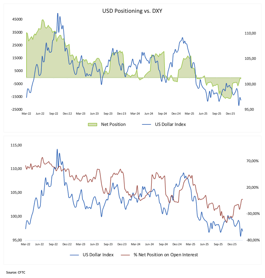 Die neuesten Daten der Commodity Futures Trading Commission (CFTC) erzählen eine ruhigere, aber wichtige Geschichte über den US-Dollar. Nicht-kommerzielle Händler (Spekulanten) haben ihre Netto-Short-Positionen weiter reduziert und sie auf ein Mehrmonatstief von etwa 730 Kontrakten in der Woche bis zum 10. Februar gesenkt. Dennoch ist der starke bärische Konsens, der im Sommer 2025 entstand, nicht mehr so überzeugend.