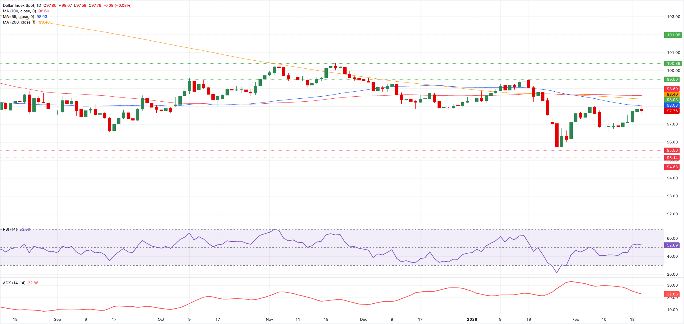 Sobald der Index über diese Zone bricht, könnte er versuchen, den kritischen 200-Tage-SMA bei 98,42 zu testen, kurz vor dem vorläufigen 100-Tage-SMA bei 98,59. Nach Norden hin erscheint die 2026er Obergrenze bei 99,49 (15. Januar), die alle der psychologischen Hürde von 100,00 vorausgeht.