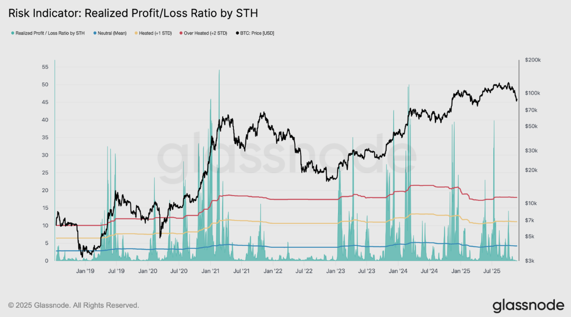 Der Bericht erläuterte zudem, dass bei einer sich abschwächenden Marktstruktur die Liquidität der entscheidende Faktor sei, um die nächsten Schritte zu verstehen. Eine längere Phase geringer Liquidität erhöhe das Risiko einer weiteren Einengung, und das Verhältnis aus realisierten Gewinnen und Verlusten der kurzfristigen Halter (STH) biete einen klaren Blick auf das aktuelle Nachfragemomentum. Dieses Verhältnis, das realisierte Gewinne und Verluste jüngerer Investoren miteinander vergleicht, fiel Anfang Oktober unter seinen neutralen Durchschnittswert (4,3-fach) und ist inzwischen auf 0,07 abgestürzt.