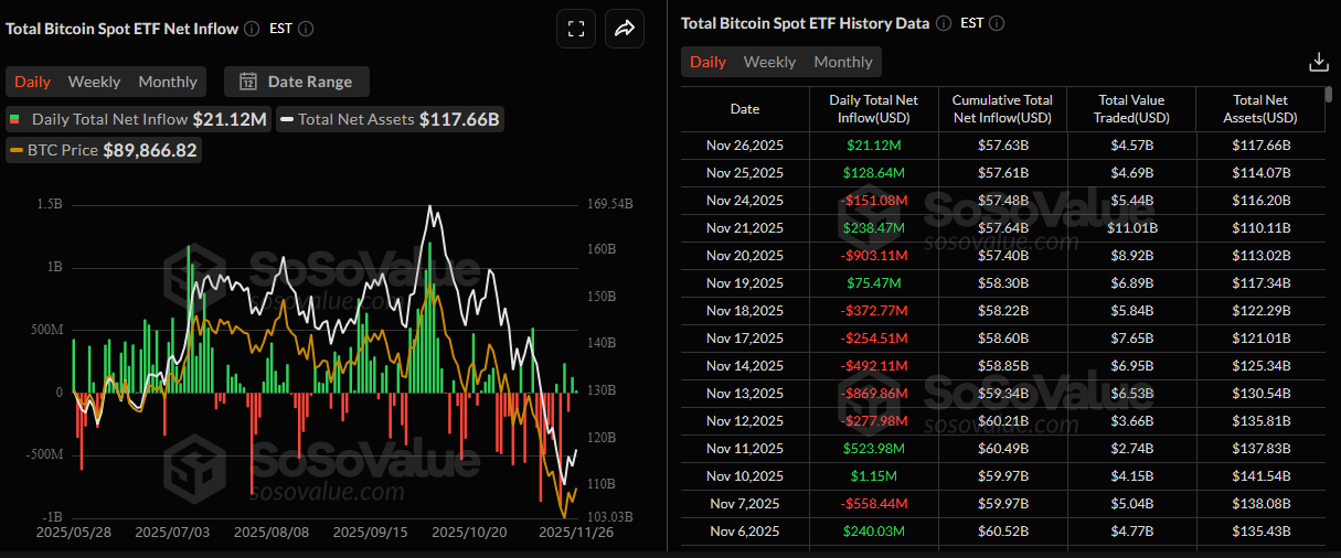 Die institutionelle Nachfrage nach Bitcoin zeigt eine Entspannung beim Verkaufsdruck. Laut Daten von SoSoValue verbuchten US-gelistete Spot-Bitcoin-ETFs am Mittwoch einen leichten Zufluss von 21,12 Millionen US-Dollar, nachdem am Vortag bereits ein positiver Mittelzufluss von 128,64 Millionen US-Dollar verzeichnet worden war. Die aktuelle Zuflussstärke reicht jedoch nicht an die massiven Abflüsse der vergangenen Woche heran. Damit BTC seine Erholung fortsetzen kann, muss sich der Zuflusstrend festigen und weiter verstärken.