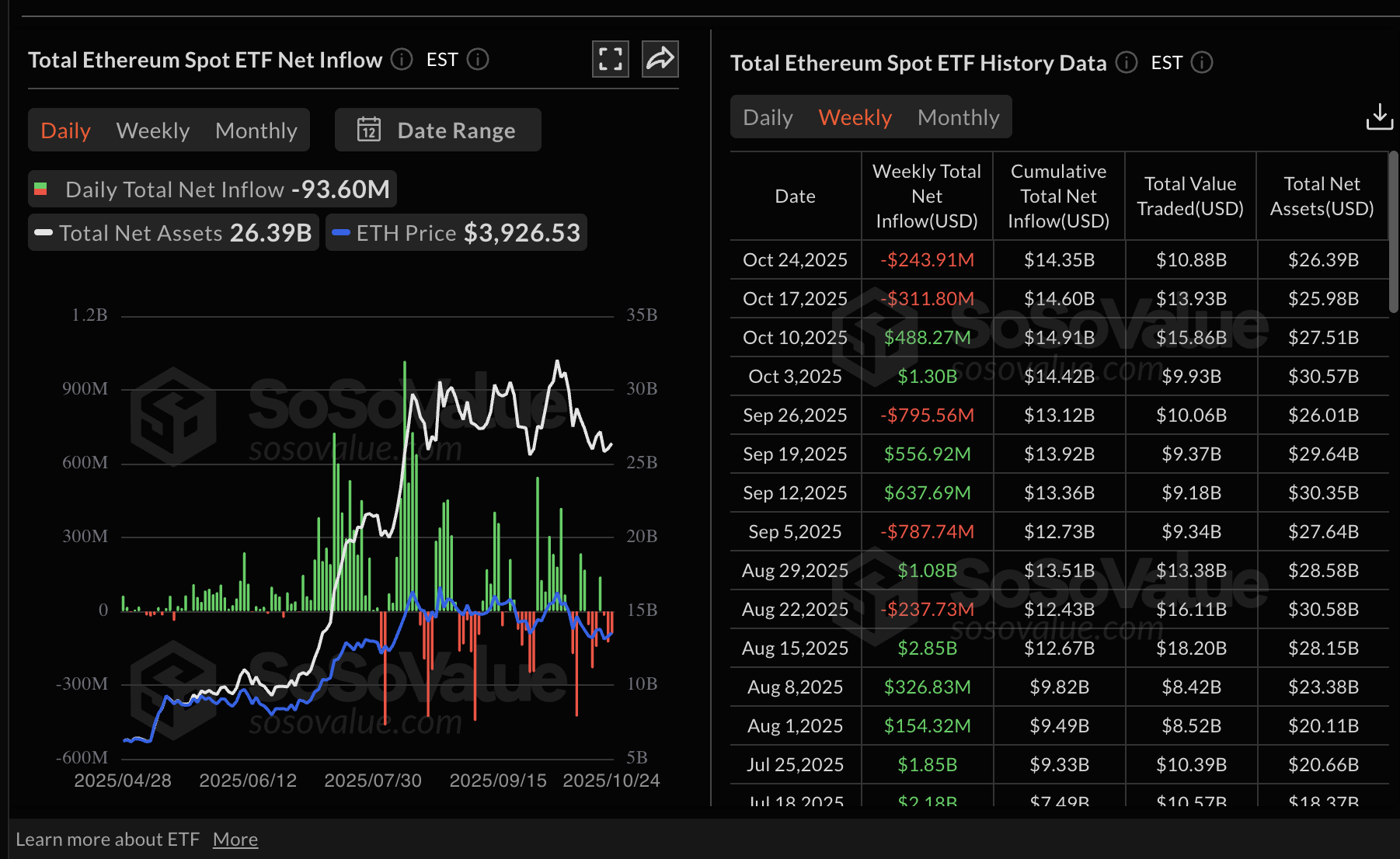 Während Bitcoin wieder Kapital anzieht, bleiben Anleger bei Ethereum-ETFs zurückhaltender. Hier kam es laut SoSoValue zu Nettoabflüssen von 244 Millionen US-Dollar in der vergangenen Woche und 312 Millionen US-Dollar in der Woche davor. Zuflüsse gab es nur an einem der fünf Handelstage, was auf eine vorsichtige Haltung unter Investoren schließen lässt.