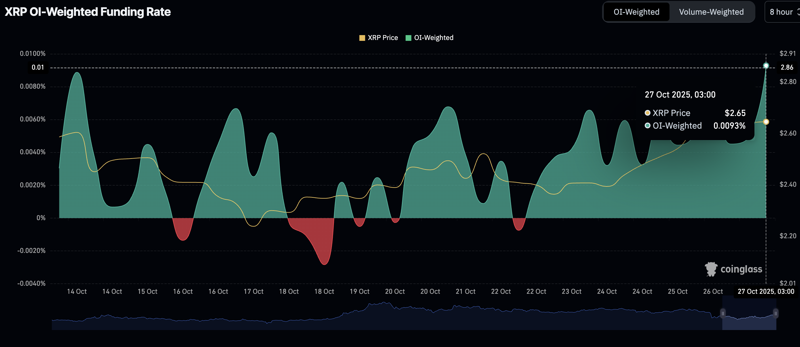 XRP zeigte sich derweil deutlich fester: Die Open-Interest-gewichtete Finanzierungsrate stieg am Montag auf 0,0093 Prozent nach 0,0045 Prozent am Sonntag. Der Indikator misst das Handelsinteresse am Token. Ein nachhaltiger Anstieg gilt als Hinweis darauf, dass Trader verstärkt Long-Positionen eingehen – ein Signal für kurzfristig positive Markterwartungen.