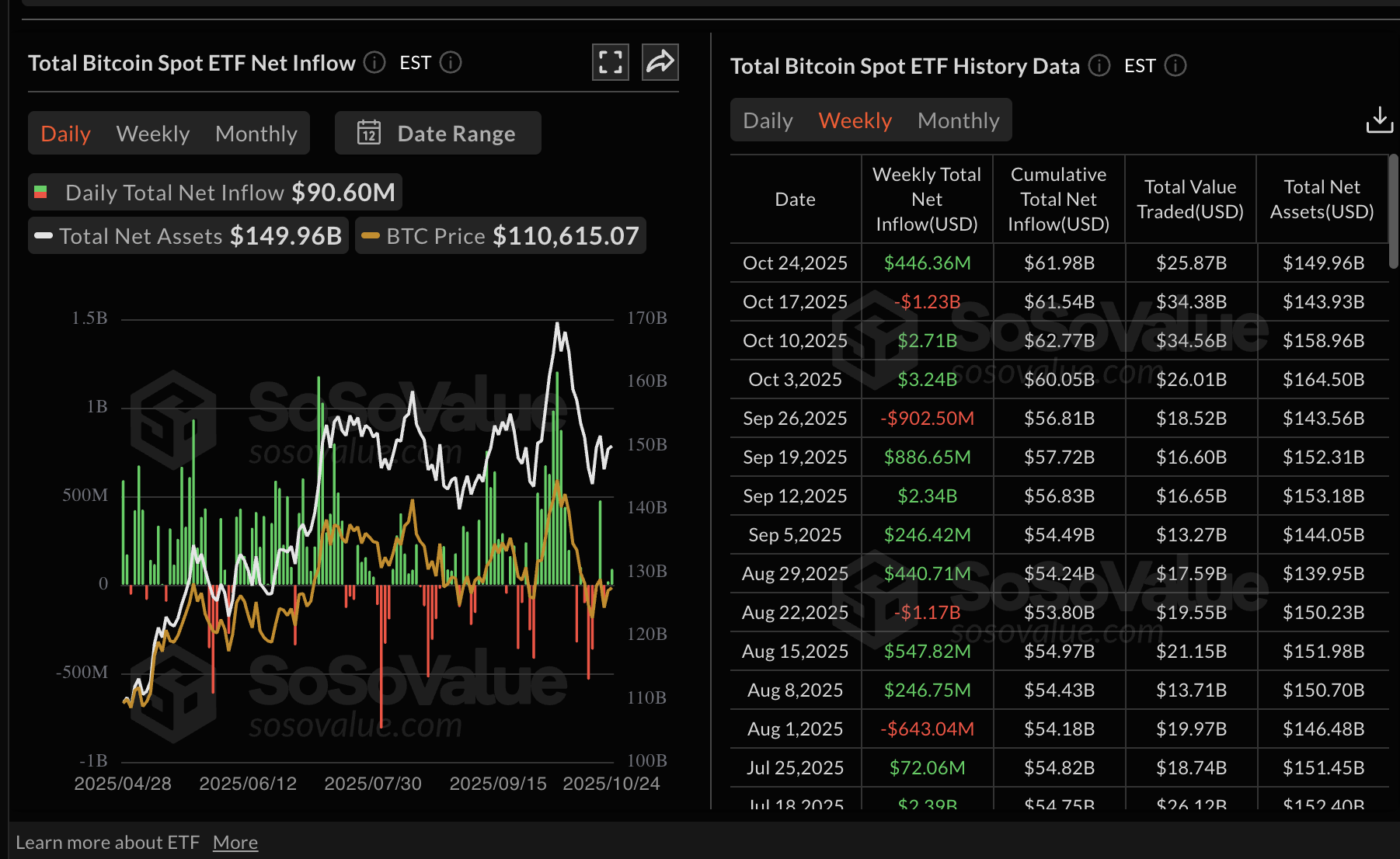 Bitcoin-ETFs verzeichneten in der vergangenen Woche Nettozuflüsse von 446 Millionen US-Dollar. Damit drehte sich der Trend nach den Abflüssen von 1,23 Milliarden US-Dollar in der Woche zuvor. Laut Daten von SoSoValue verzeichneten US-börsennotierte ETFs an drei von fünf Handelstagen Zuflüsse – ein Zeichen für zunehmendes institutionelles Interesse.