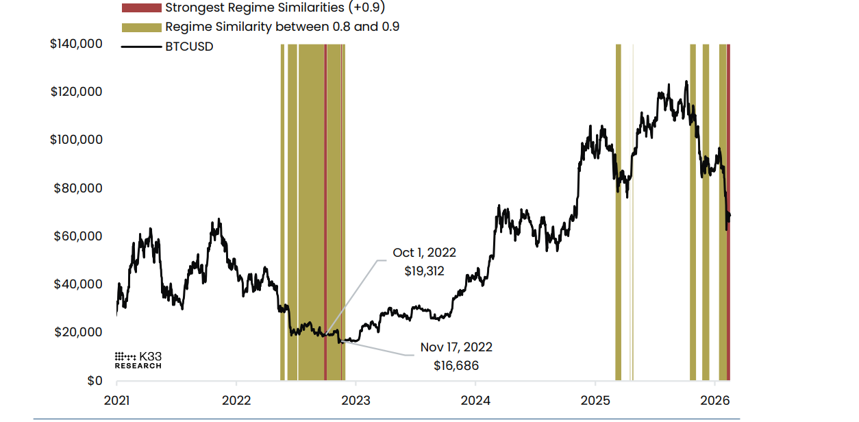 In einem am Dienstag veröffentlichten Bericht erklärte K33-Researchchef Vetle Lunde, das aktuelle Marktregime weise starke Parallelen zu den Phasen im Oktober und November 2022 auf. Diese hätten sich nahe dem globalen Tiefpunkt des vergangenen Bärenmarktes abgespielt. In diesen Zeiträumen hätten die Kurse weitgehend seitwärts tendiert, während Bitcoin durchschnittliche Renditen zwischen -3,5 und +3 Prozent verzeichnet habe.