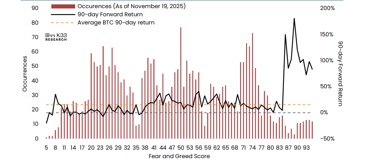 Vorwärtsrenditen von BTC bei verschiedenen Fear-and-Greed-Werten. Quelle: K33