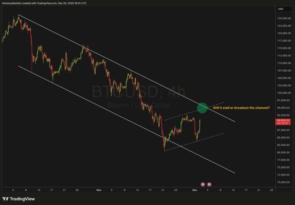 Beim Blick auf den 4-Stunden-Chart von BTC/USD zeigt sich, dass der Kurs seit Anfang Oktober in einem fallenden Trendkanal festsaß und dabei durchgehend tiefere Hochs und tiefere Tiefs markierte. Zuletzt hat sich jedoch etwas verändert — der Kurs scheint nahe der unteren Begrenzung dieses Kanals einen Boden gefunden zu haben. Seitdem hat Bitcoin einen kräftigen Impuls nach oben gezeigt, was erste Lebenszeichen der Bullen erkennen lässt.
