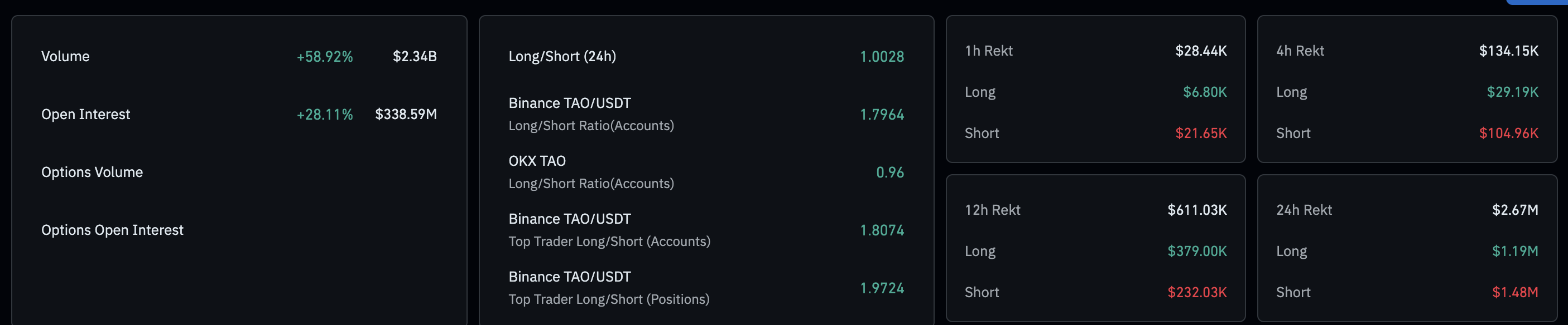 Die Stimmung der Händler rund um Bittensor im Derivatemarkt hat sich nach dem Flash-Crash am Freitag wieder auf ein hohes Niveau zurückbewegt. Daten von CoinGlass zeigen, dass das Open Interest (OI) der TAO-Futures bei 338,59 Millionen USD liegt, mit einem Anstieg von 28% in den letzten 24 Stunden. Dieser zweistellige Anstieg bezieht sich auf einen Anstieg des nominalen Wertes der ausstehenden Futures-Kontrakte, was signalisiert, dass die Händler ihr Risiko erhöhen.