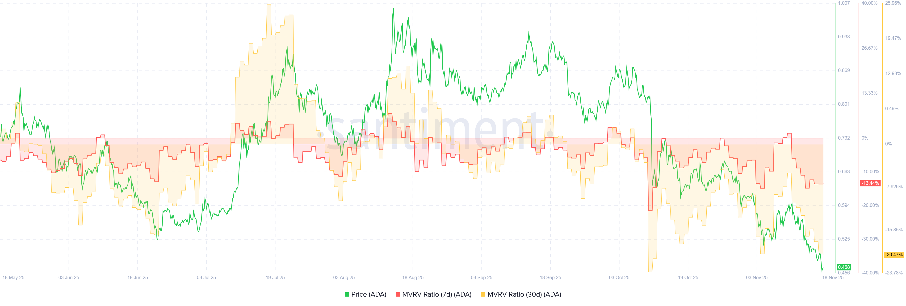 Santiments MVRV-Kennzahl (Market Value to Realized Value) wird genutzt, um festzustellen, ob ein Token in einem bestimmten Zeitraum über- oder unterbewertet ist. Für Cardano liegen die 30-Tage- und 7-Tage-MVRV-Werte derzeit bei minus 20,47 % beziehungsweise minus 13,44 %. Das bedeutet, dass ADA aktuell unterbewertet ist.