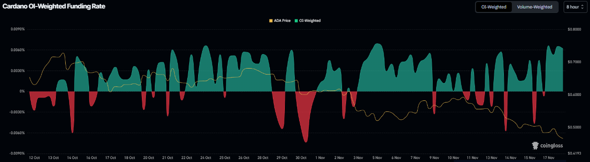 Neben der Unterbewertung unterstützen auch Derivatedaten eine mögliche Erholungsbewegung bei Cardano. Laut den OI-Weighted-Funding-Rate-Daten von Coinglass ist die Zahl der Händler, die auf weiter fallende ADA-Kurse setzen, geringer als die der Marktteilnehmer, die einen Anstieg erwarten.