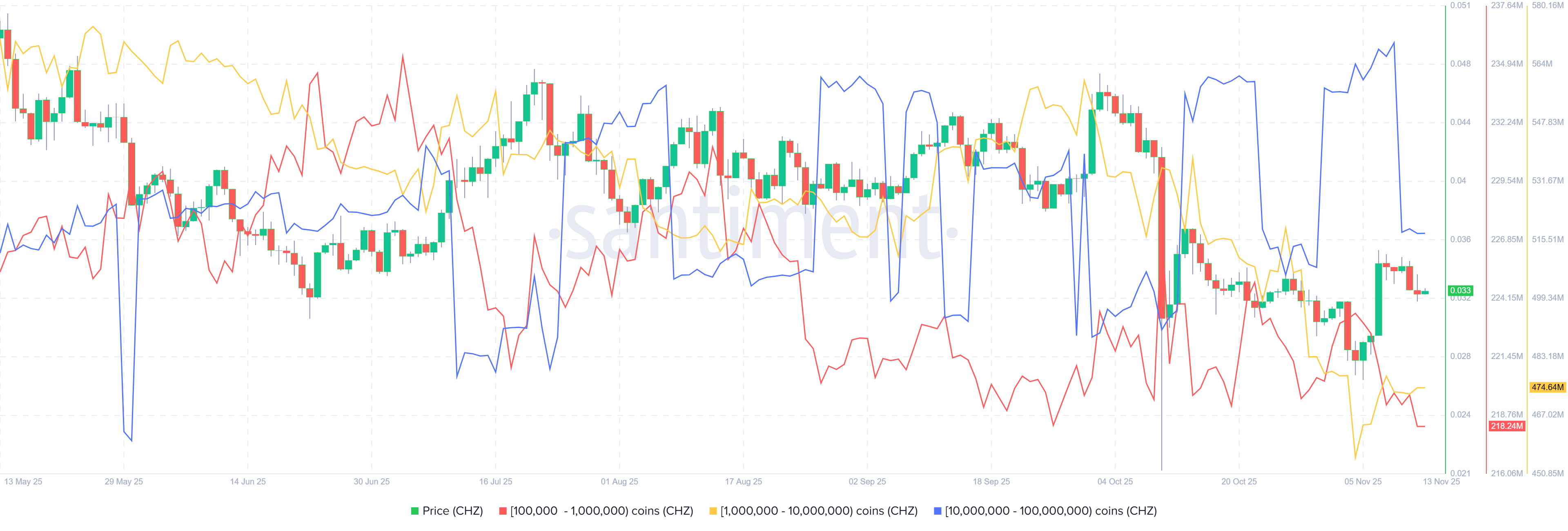 Die Supply-Distribution-Daten von Santiment stützen einen bearishen Ausblick für CHZ, da die Zahl großer Wallet-Inhaber (Wale) ihr Engagement reduziert.