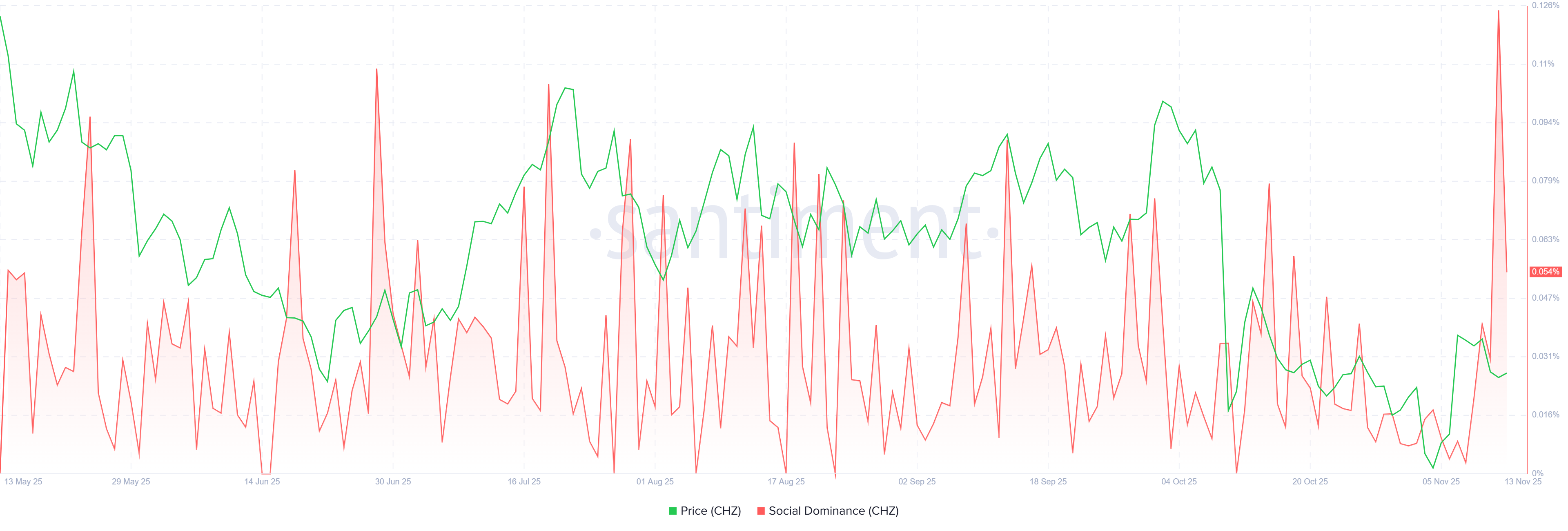 Zudem untermauert der Social-Dominance-Indikator von Santiment für CHZ die negative Tendenz. Der Index misst den Anteil CHZ-bezogener Diskussionen in den Kryptomedien. Er fiel deutlich von 0,124 % am Mittwoch auf 0,054 % am Donnerstag – ein Zeichen für schwindendes Anlegerinteresse und geringere Community-Aktivität rund um Chiliz. Das deutet darauf hin, dass Marktteilnehmer angesichts steigenden Verkaufsdrucks zunehmend das Interesse am Token verlieren.