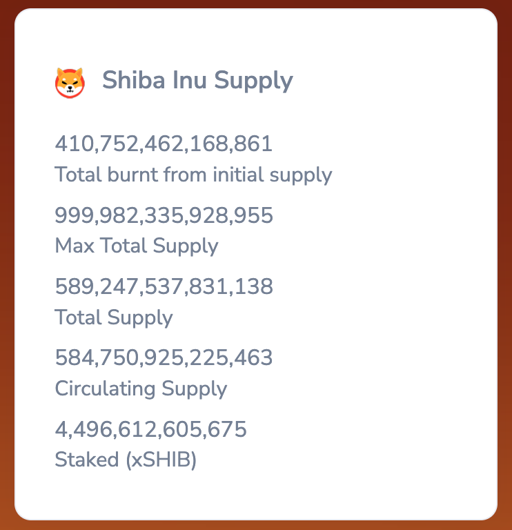 Shiba Inu, die zweitgrößte Meme-Münze nach Marktkapitalisierung mit 7,1 Milliarden Dollar zum Zeitpunkt des Schreibens, führt regelmäßige Token-Burns über das Community-Burn-Portal, die Gebührenumwandlung zum Verbrennen und das Halter-Burning an eine tote Wallet durch, alles verfolgt von Shibburn. Bis zum 10. Oktober wurden 410,75 Billionen SHIB-Token aus dem maximalen Angebot von 999,98 Billionen SHIB verbrannt.