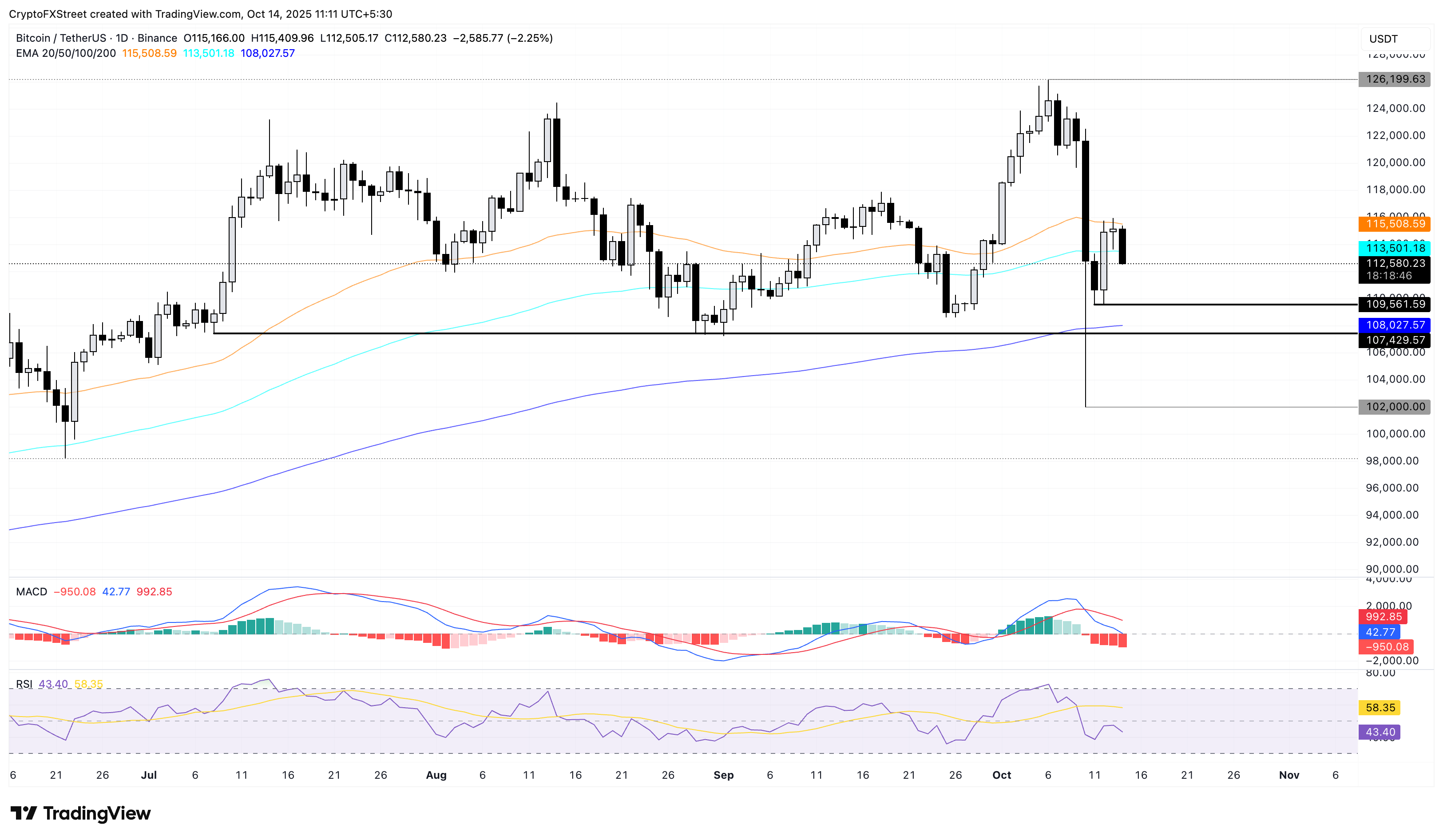 Bitcoin vollzieht eine bärische Umkehr vom 50-Tage-Exponential Moving Average (EMA) bei 115.508 USD, was das Risiko einer Verlängerung der dreitägigen Korrektur der letzten Woche birgt, einschließlich des Rückgangs von 7% am Freitag. Zum Zeitpunkt der Berichterstattung nähert sich BTC 112.500 USD und untergräbt die Unterstützung des 100-Tage-EMA bei 113.501 USD.