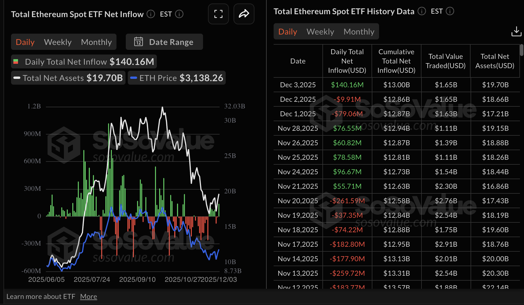 Ethereum-Spot-ETFs verzeichneten am Mittwoch Zuflüsse in Höhe von 140 Millionen US-Dollar, nachdem sie zwei Tage in Folge Abflüsse verzeichnet hatten. Am Dienstag beliefen sich die Abflüsse auf insgesamt 10 Millionen US-Dollar, während sie am Montag insgesamt 79 Millionen US-Dollar betrugen. Das kumulierte Nettozuflussvolumen beträgt durchschnittlich 13 Mrd. USD, bei einem Nettovermögenswert von 19,7 Mrd. USD zum 3. Dezember.