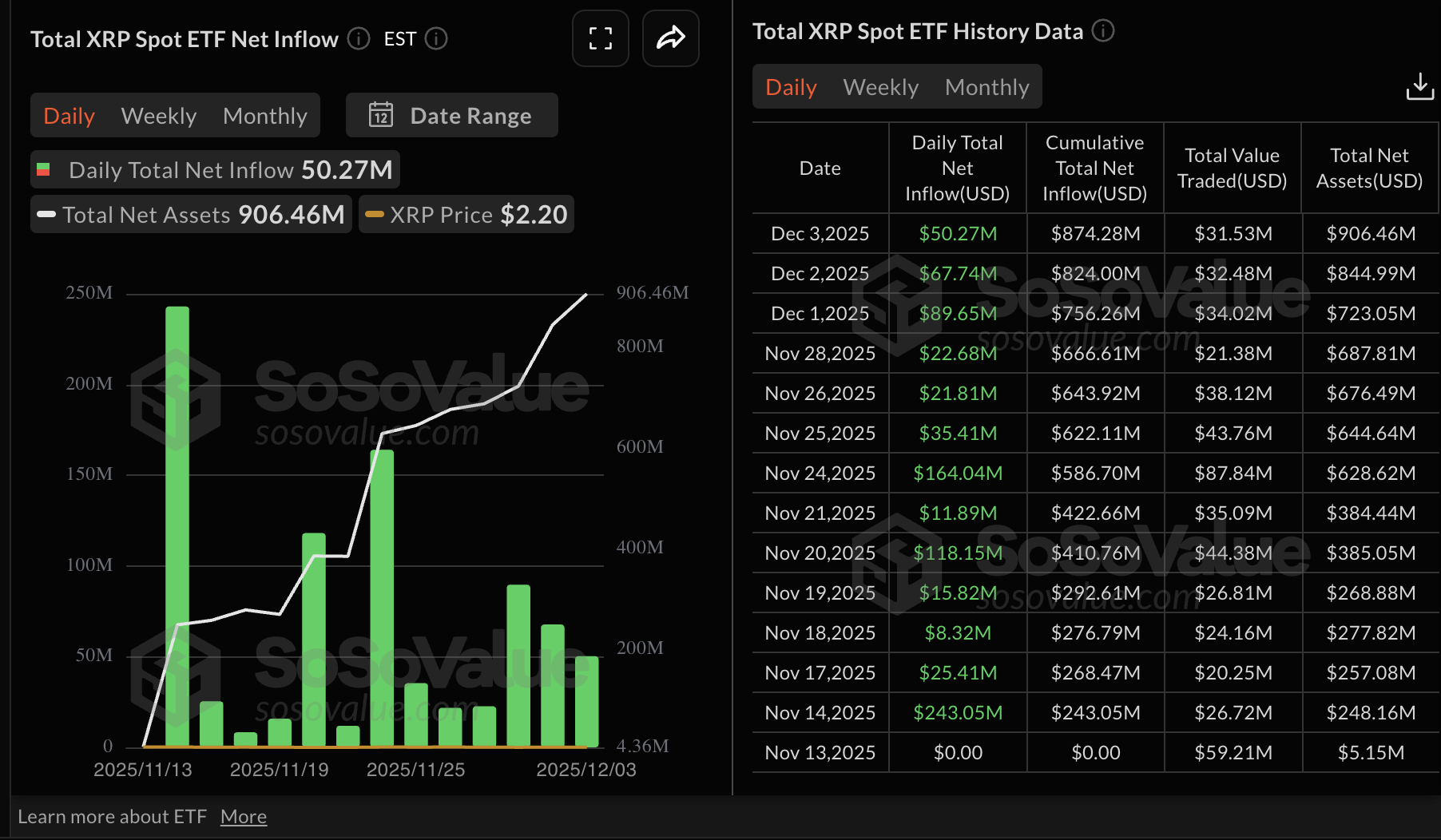 XRP hingegen verzeichnet weiterhin stetige ETF-Zuflüsse, was auf eine mögliche Verlagerung des Interesses der Anleger hin zu Altcoin-basierten Anlageprodukten hindeutet. Wie aus der folgenden Grafik hervorgeht, verzeichneten in den USA notierte XRP-ETFs am Mittwoch Zuflüsse in Höhe von rund 50 Millionen US-Dollar und setzten damit ihre 13-tägige positive Serie fort. Bislang weisen XRP-ETFs kumulierte Zuflüsse in Höhe von 874 Millionen US-Dollar und ein Nettovermögen von 906 Millionen US-Dollar auf.