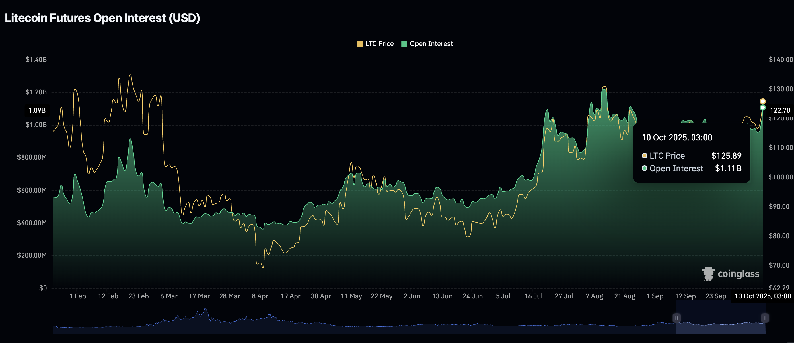 Die Nachfrage nach Litecoin-Derivaten ist deutlich gestiegen, wobei die offenen Positionen (OI) am Freitag durchschnittlich 1,11 Milliarden US-Dollar betrugen, gegenüber etwa 795 Millionen US-Dollar am 1. Oktober. Der Anstieg der OI, die den Nominalwert der ausstehenden Terminkontrakte darstellen, deutet auf eine Verbesserung der bullischen Stimmung rund um LTC hin. Der stetige Anstieg des OI zeigt auch, dass die Anleger zuversichtlich sind, dass der Token den Aufwärtstrend kurzfristig aufrechterhalten kann. Diese Überzeugung erhöht ihre Risikobereitschaft und trägt zum Kaufdruck bei.