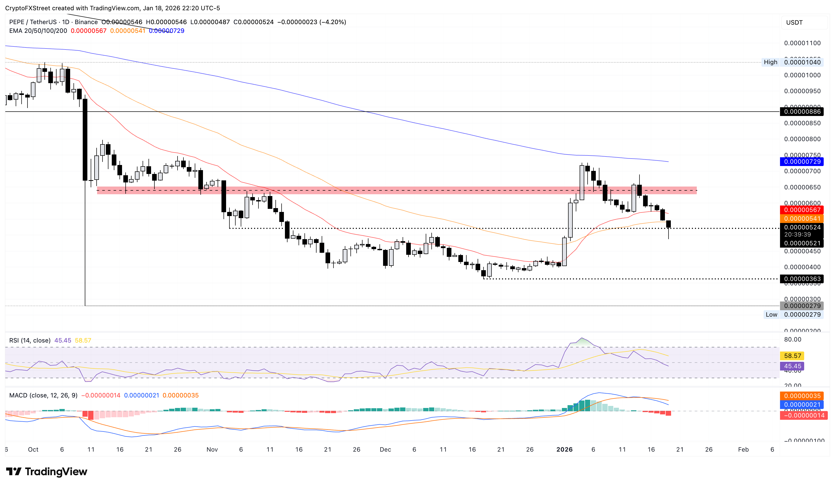 Pepe bleibt unter extremem Verkaufsdruck und beginnt seine dritte aufeinanderfolgende bärische Woche. Zum Zeitpunkt der Erstellung ist die froschthemenbasierte Meme-Münze am Montag um 4% gefallen und hat den 50-tägigen EMA bei 0,00000541 USD unterschritten.