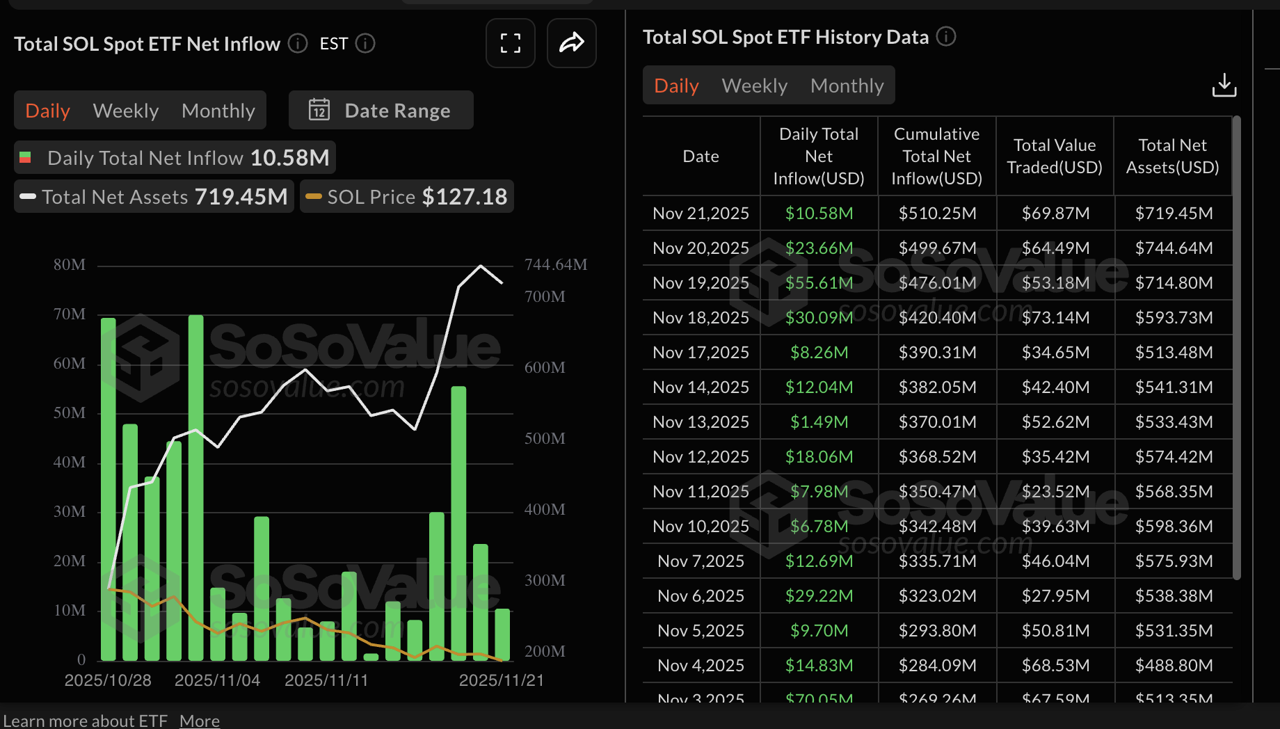 In den USA gelistete Solana-Exchange-Traded-Funds (ETFs) haben ihre Serie an stetigen Zuflüssen fortgesetzt und am Freitag nahezu 11 Millionen US-Dollar verzeichnet. Laut SoSoValue summieren sich die kumulierten Nettozuflüsse der SOL-ETFs auf rund 510 Millionen US-Dollar, wobei die Nettovermögenswerte im Schnitt bei 719 Millionen US-Dollar liegen.