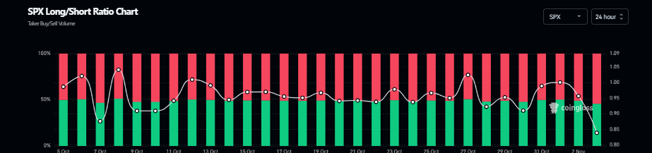 Die Derivatkennzahlen für SPX6900 zeigen eine bärische Tendenz. Das Long-to-Short-Verhältnis von CoinGlass für SPX lag am Montag bei 0,83, dem niedrigsten Niveau seit über einem Monat, was zu steigenden bärischen Wetten unter den Händlern führte.