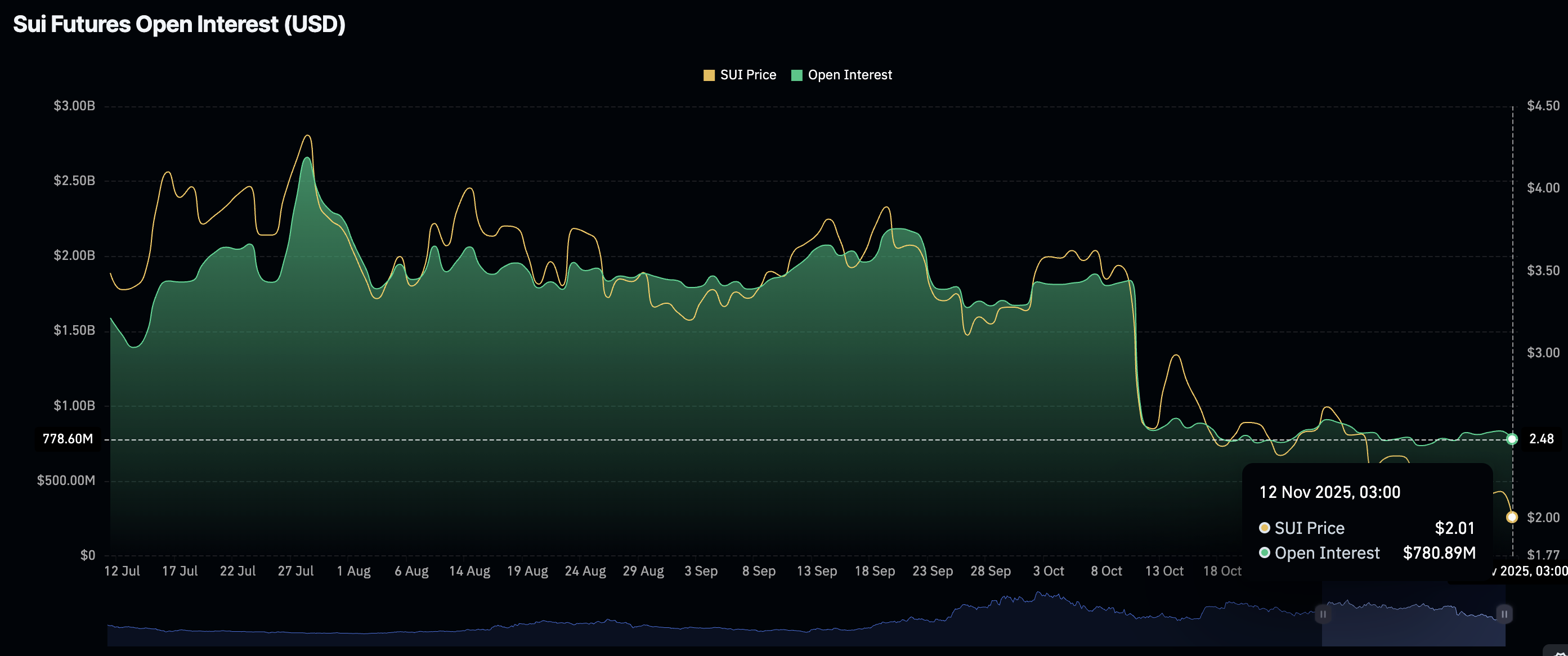 - Die Nachfrage im Einzelhandel bleibt verhalten, wobei das Open Interest von SUI stabil bei 781 Millionen US-Dollar liegt.