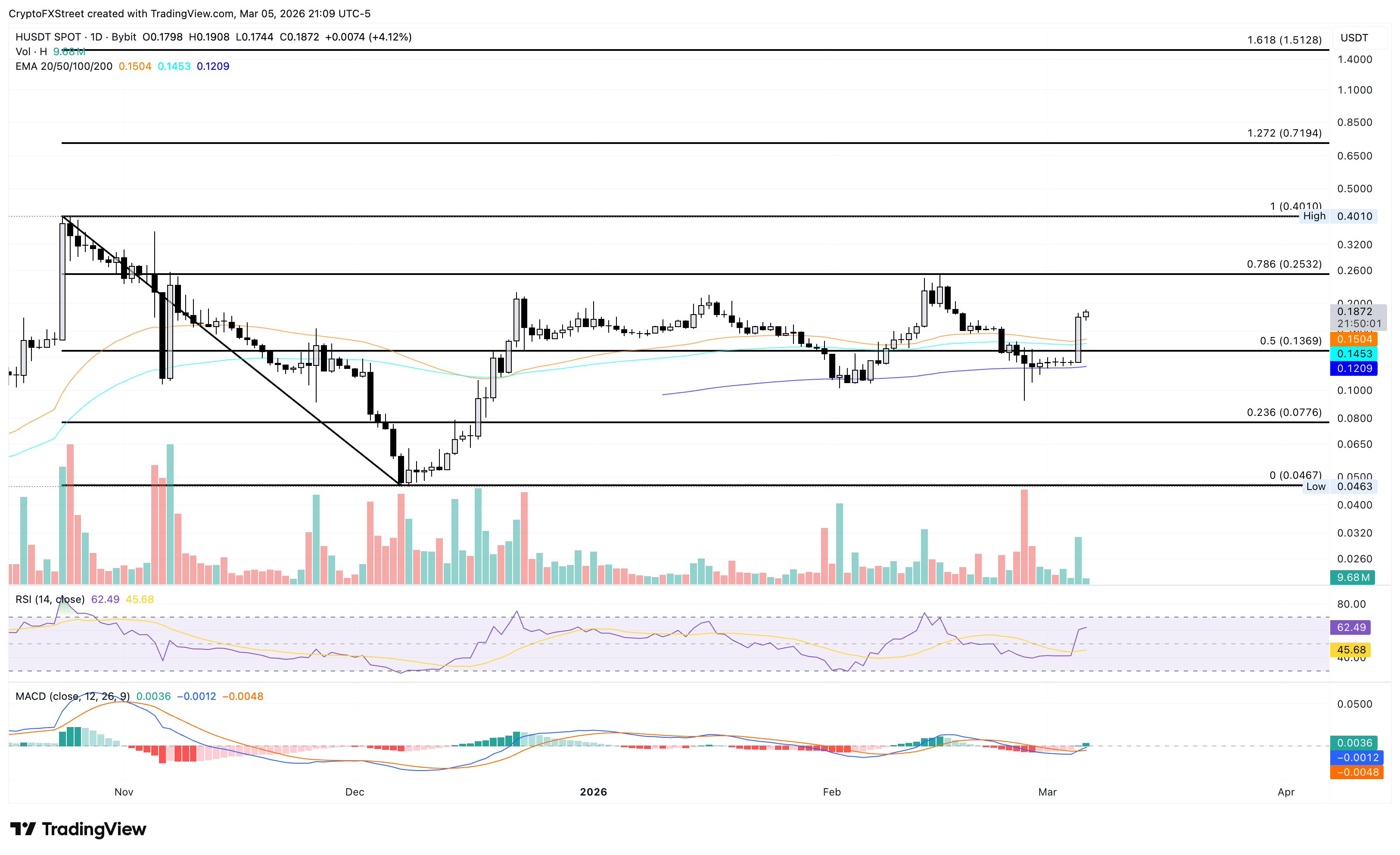Humanity Protocol stieg am Donnerstag um 43% und überschritt die 200-Tage-Exponential Moving Average (EMA) bei 0,1209 USD. Zum Zeitpunkt der Berichterstattung ist H am Freitag um 4% gestiegen und nähert sich der runden Marke von 0,2000 USD.