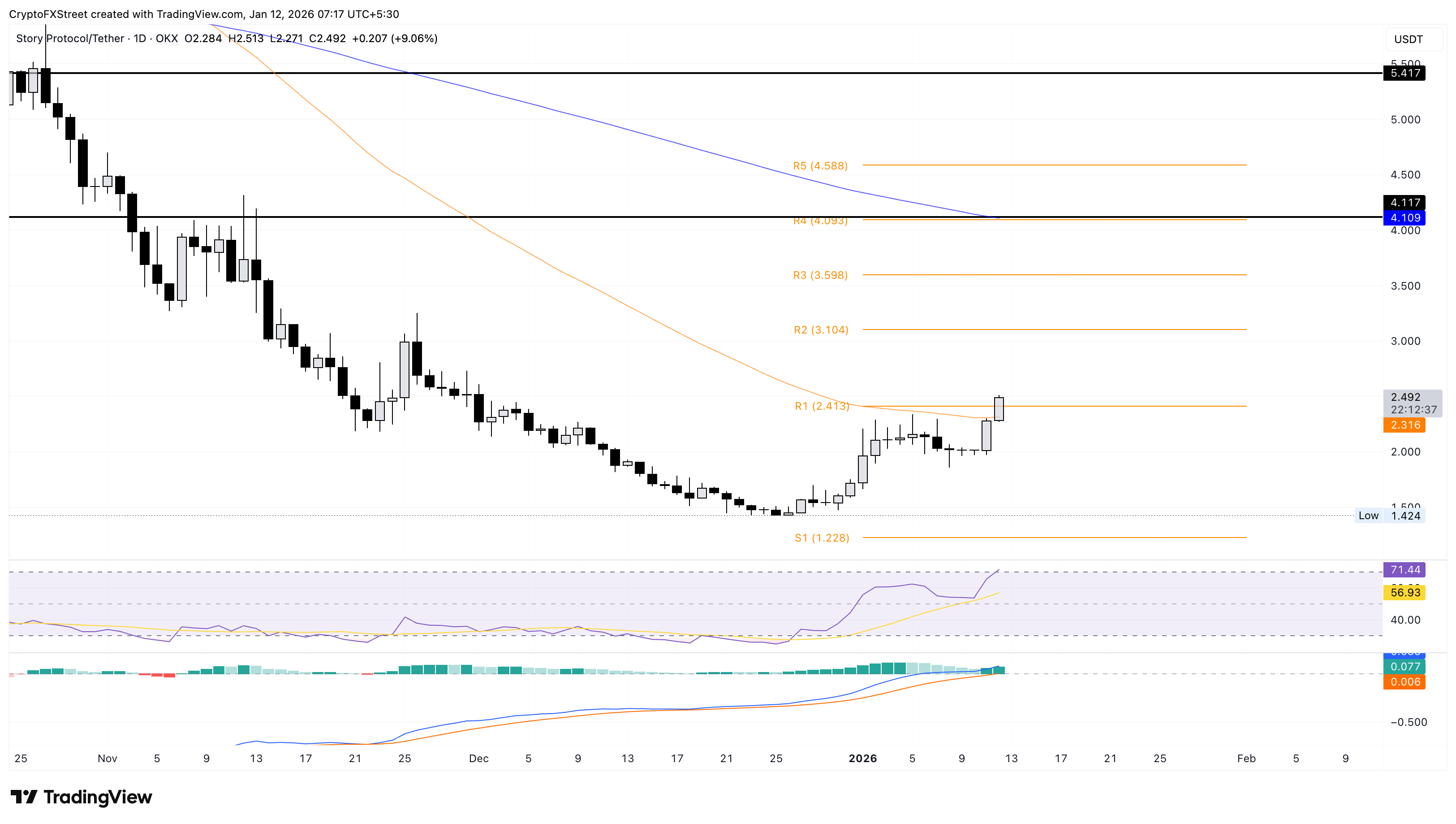 Story gewinnt zum Zeitpunkt der Presseberichterstattung am Montag um 9% und steigt über den 50-Tage exponentiell gleitenden Durchschnitt (EMA) bei 2,31 USD nach einem Anstieg von 13% am Sonntag. Die Meme-Münze hat den R1-Pivotpunkt bei 2,41 USD überschritten und nähert sich 2,50 USD.