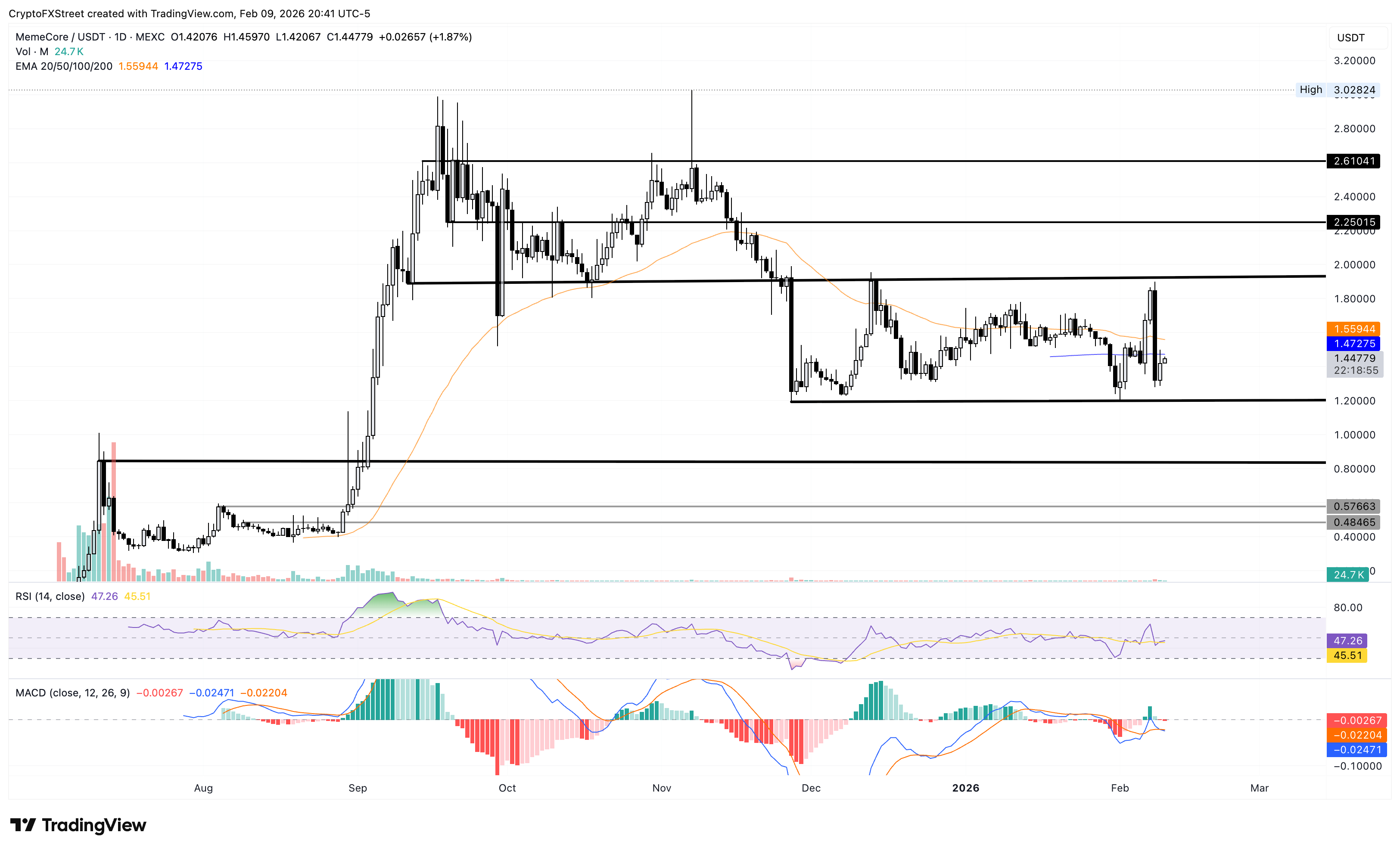 MemeCore ist am Dienstag um fast 4 % gestiegen und hat damit die 7 % Erholung vom Montag fortgesetzt. Dies markiert einen bullischen Start in die Woche nach einem Rückgang um 28 % am Sonntag.
