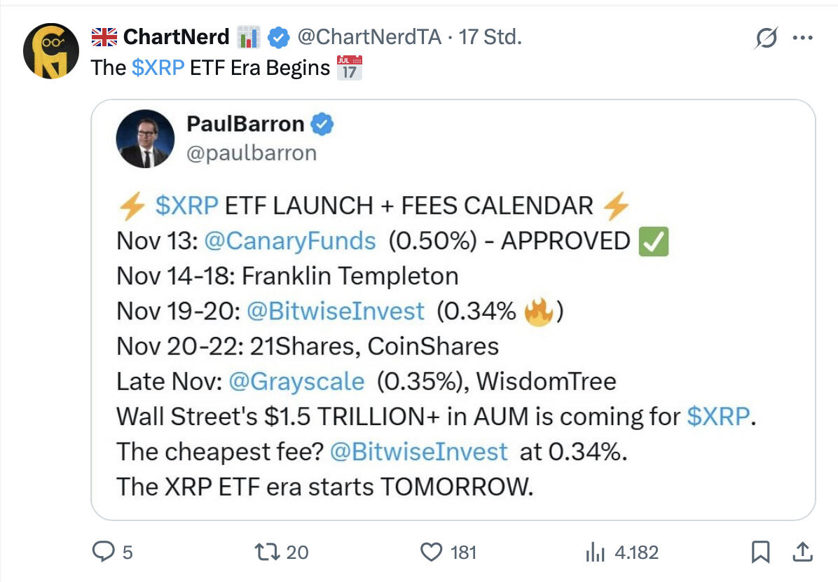 Und genau das ist der Punkt, der im Markt derzeit hohe Erwartungen weckt: Wenn sich genug frisches Kapital auf ETF-Ebene sammelt, muss der Fonds XRP physisch kaufen. Steigt die Nachfrage, reagiert der Preis. Oft schneller, als der Markt es erwartet.