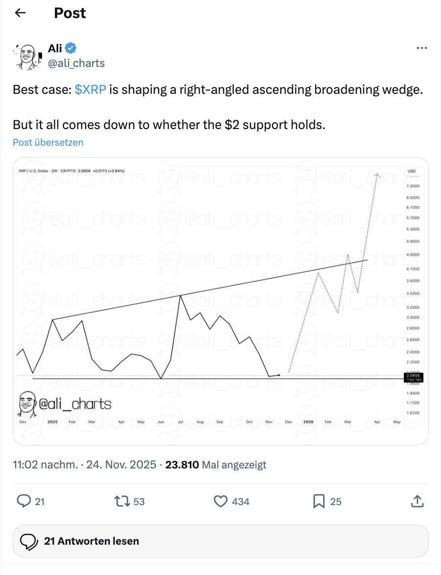 Doch Martinez setzt eine klare Bedingung: Diese Struktur bleibt nur intakt, wenn XRP über der Marke von 2 US-Dollar bleibt.