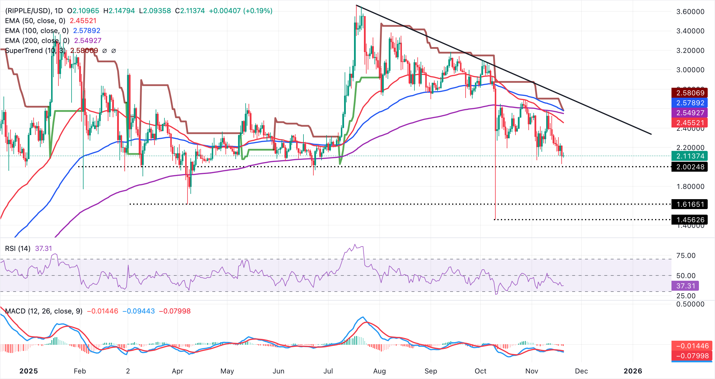 XRP stemmt sich am Donnerstag über die Marke von 2,00 US-Dollar. Doch charttechnisch ist der Gegenwind deutlich. Der Coin notiert unter allen wichtigen gleitenden Durchschnitten: der 50-Tage-EMA bei 2,45 US-Dollar, der 100-Tage-EMA bei 2,57 US-Dollar und der 200-Tage-EMA bei 2,54 US-Dollar. Alle drei fallen – ein klares Zeichen, dass der Abwärtstrend weiter dominiert.