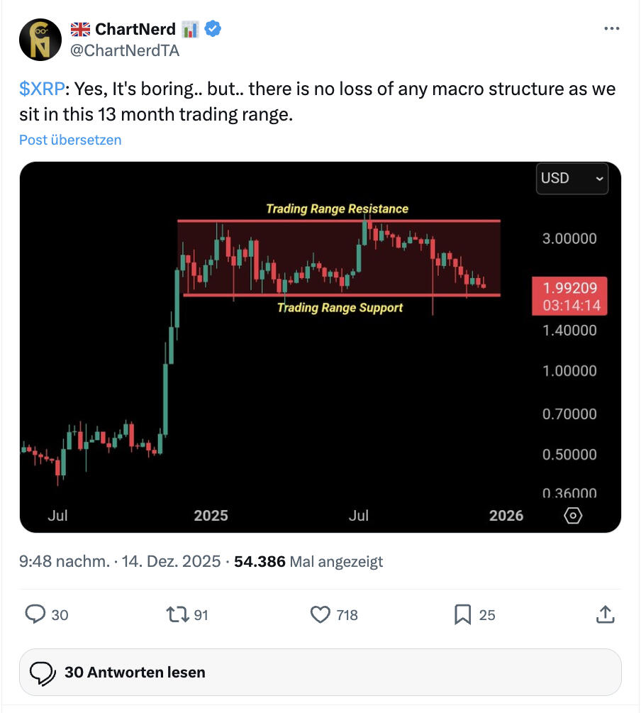 Trotz aller Warnzeichen gibt es einen Punkt, den du nicht ignorieren solltest. ChartNerd verweist darauf, dass XRP sich weiterhin in einer großen Seitwärtsrange befindet, die bereits seit 13 Monaten anhält. Diese Spanne reicht von knapp unter 2 US-Dollar bis in einen Widerstandsbereich leicht oberhalb von 3 US-Dollar.