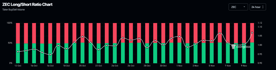 Darüber hinaus lag das Long-to-Short-Verhältnis für die auf Datenschutz ausgerichtete Kryptowährung am Montag bei 1,06 und erreichte damit den Monatshöchststand. Dieses Verhältnis, das über eins liegt, spiegelt die bullische Stimmung an den Märkten wider, da immer mehr Händler auf eine Rally des ZEC setzen.