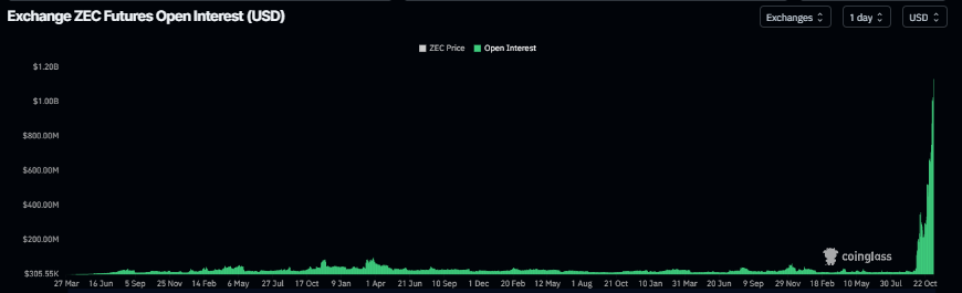 Die Daten von CoinGlass zeigen, dass die OI für ZEC-Futures an den Börsen am Montag auf ein neues Allzeithoch von 1,13 Mrd USD gestiegen ist. Eine steigende OI steht für neues oder zusätzliches Geld, das in den Markt fließt, und für neue Käufe, was die aktuelle Kursrallye von ZEC beflügeln könnte.