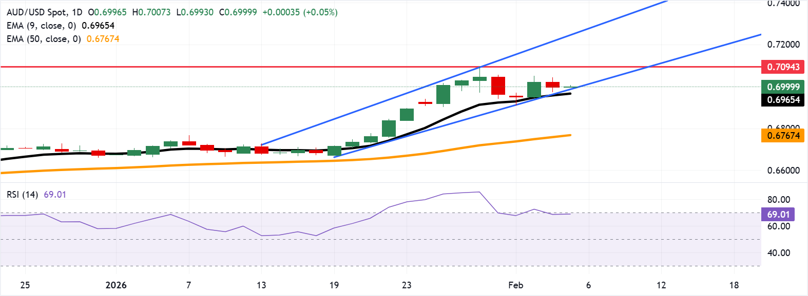 Das Währungspaar AUD/USD wird am Donnerstag um 0,7000 gehandelt. Die Analyse der Tages-Chart zeigt, dass sich das Paar innerhalb des aufsteigenden Kanal-Musters befindet, was auf eine anhaltende bullische Tendenz hinweist. Der 14-Tage Relative Strength Index (RSI) liegt bei 69; dies signalisiert typischerweise bullisches Momentum.
