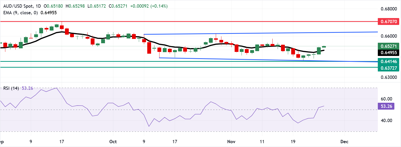 Das Währungspaar AUD/USD wird am Donnerstag bei etwa 0,6530 gehandelt. Die Analyse des Tagescharts zeigt, dass das Paar sich innerhalb einer rechteckigen Konsolidierungszone hält, was auf eine neutrale Tendenz hinweist. Das Paar hat den neuntägigen Exponential Moving Average (EMA) überschritten, was darauf hinweist, dass das kurzfristige Aufwärtsmomentum stärker geworden ist.