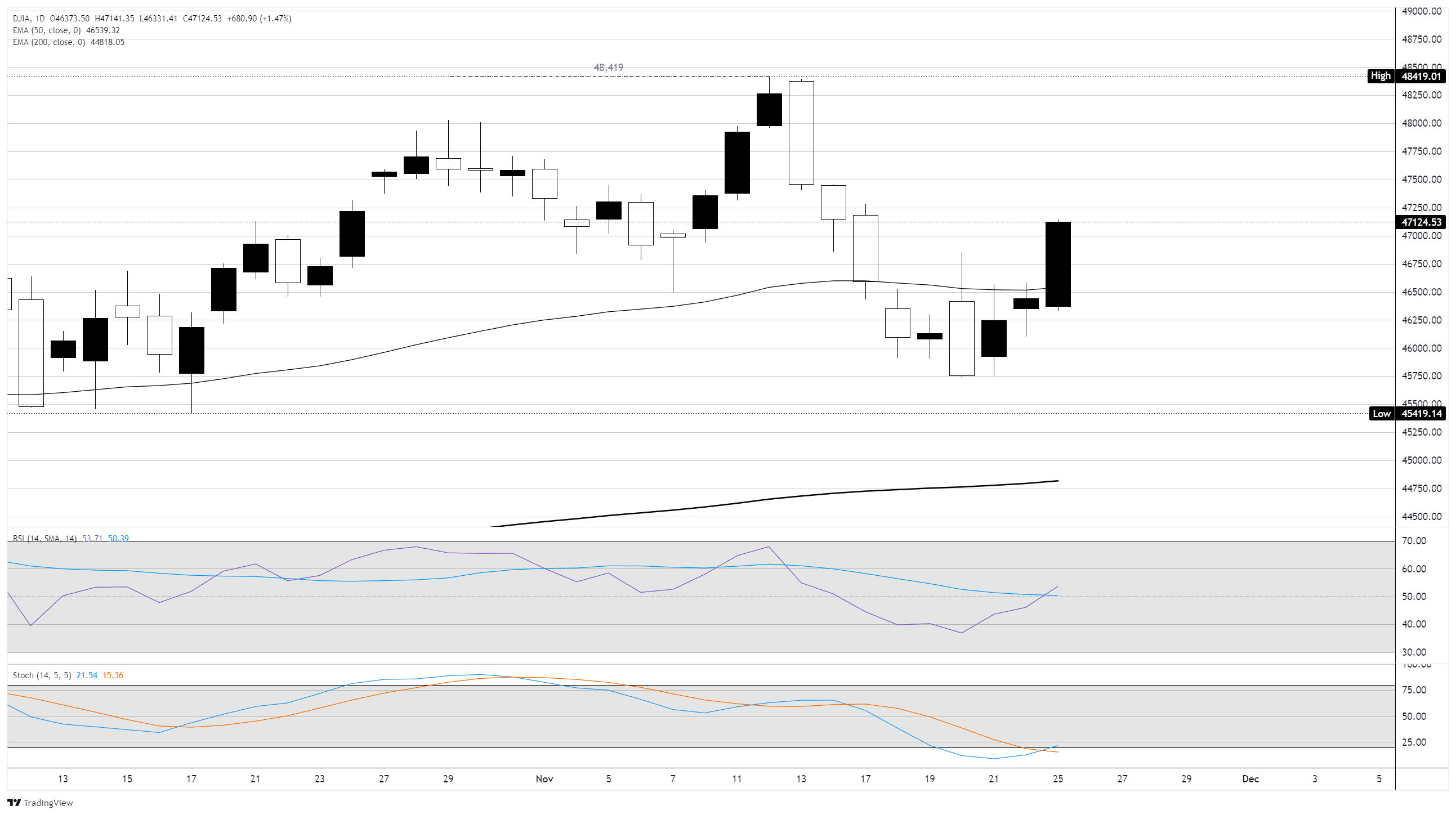 Der Dow Jones Industrial Average (DJIA) gewann am Dienstag über 550 volatile Punkte und erholte sich aus einem frühen Volatilitätsausbruch, während die Anleger mit den widersprüchlichen Schlagzeilen umgingen. Die Märkte stabilisierten sich schließlich in einer bullischen Tendenz während einer verkürzten Handelswoche, aber wichtige Technologiewerte ziehen weiterhin das rallyeführende AI-Segment nach unten.